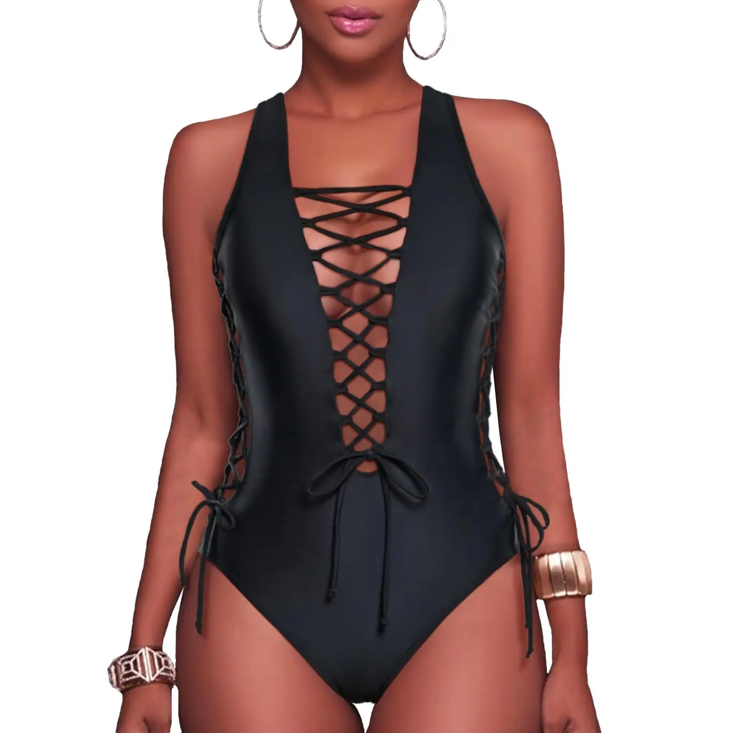 ·Our company offers a selection of sexy one-piece swimsuits that are perfect for any beach day. The swimsuits feature a deep V-neck and lace-up details at the front, with strappy lace-up openings on the sides. The high-cut legs and cross-back design complete this flattering style.