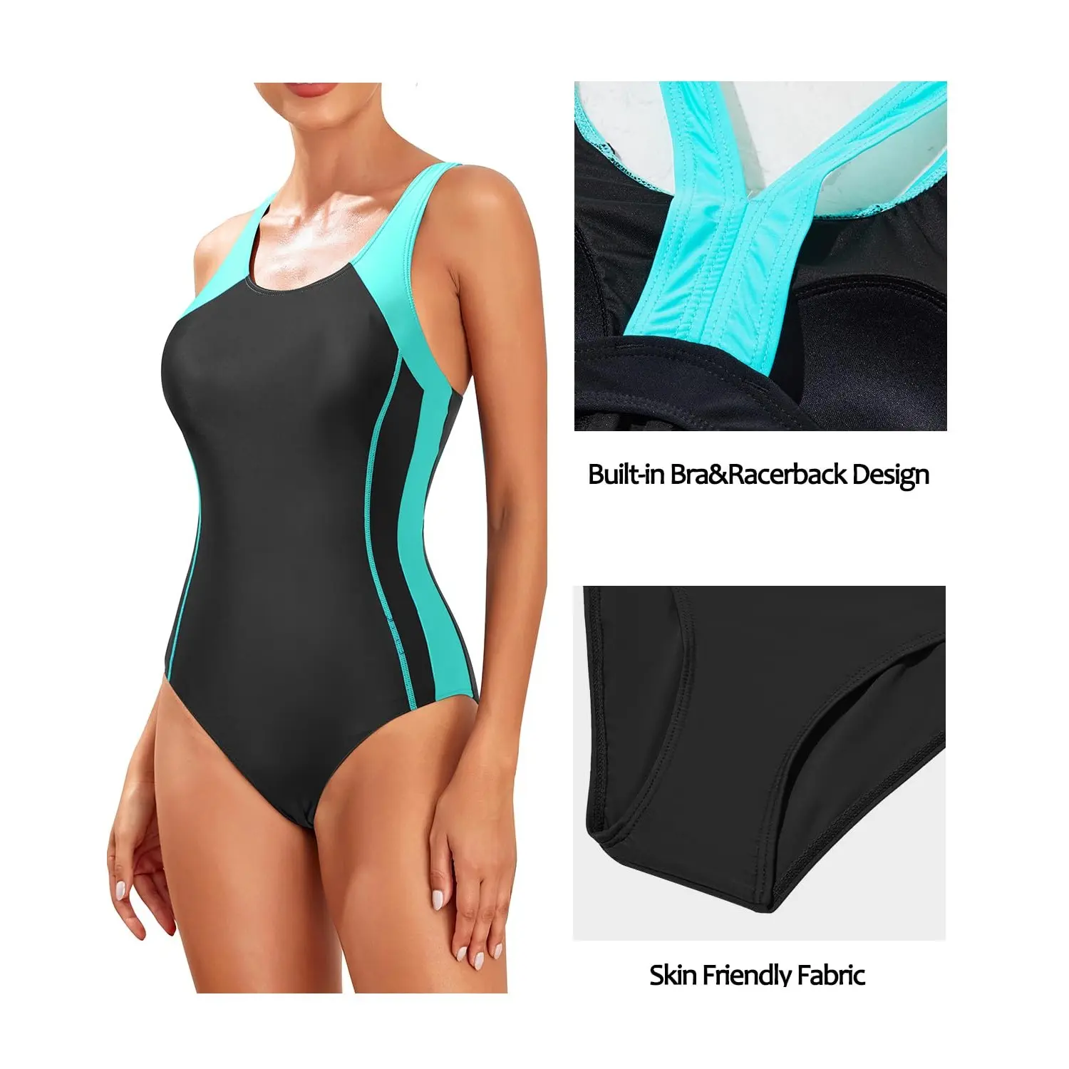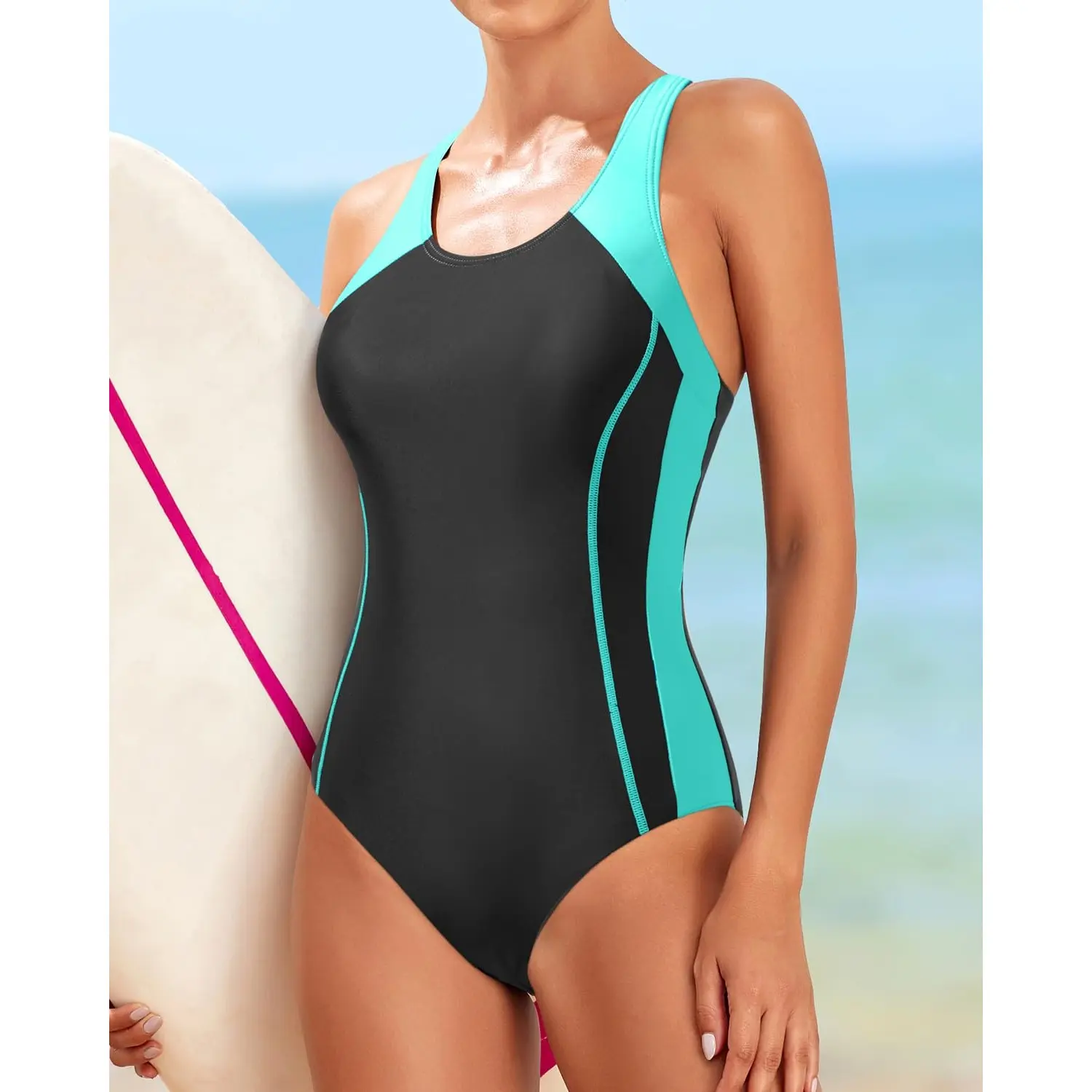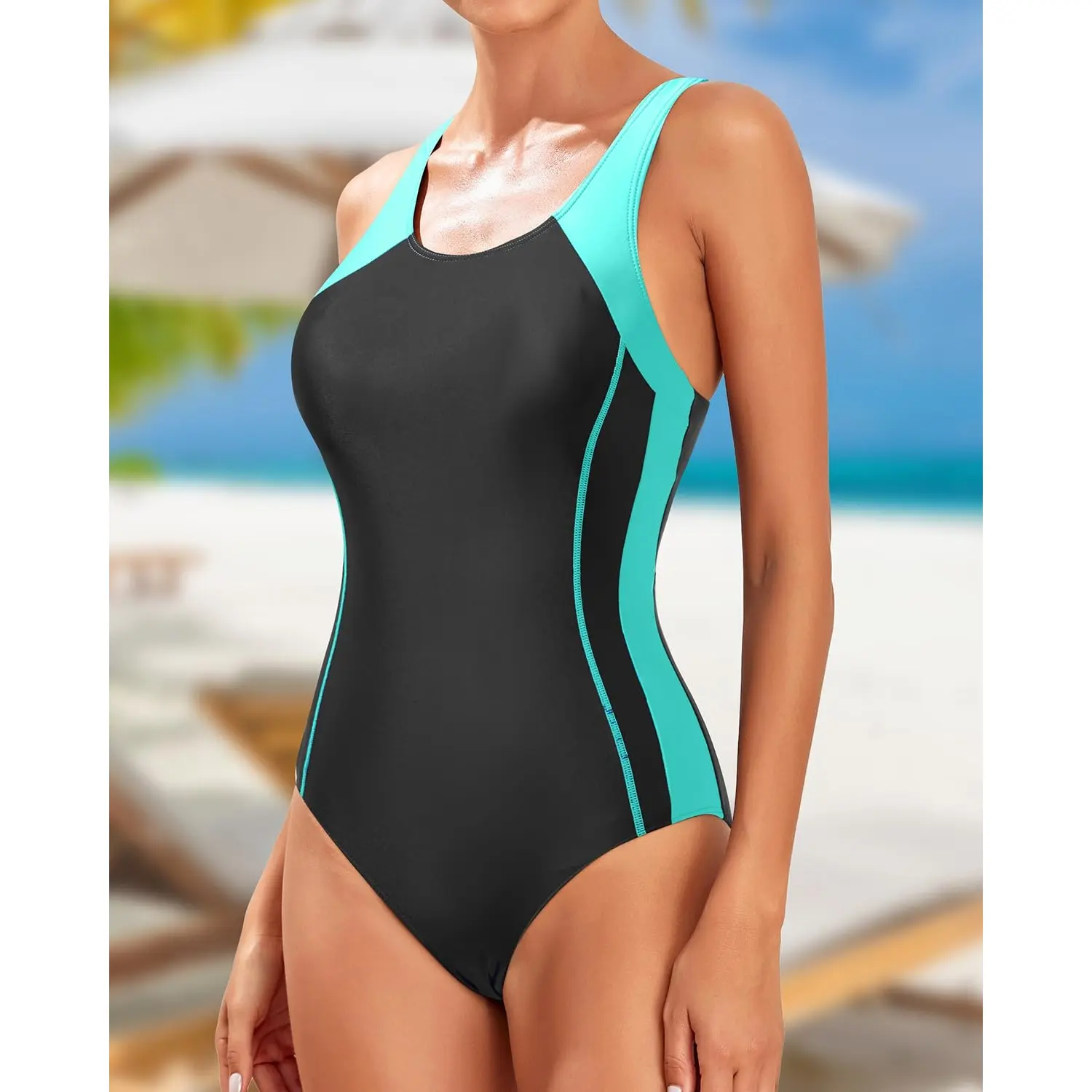 ·This contrast side splicing athletic one-piece swimsuit is so flattering and appropriate for women, teens, girls, juniors, ladies, and moms for swimming workouts at the gym.
