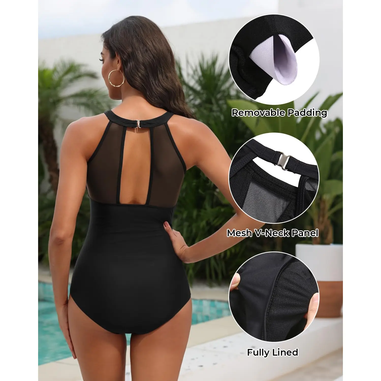 ·The see-through mesh style and deep plunge back design add a touch of charm, awesomeness, and chicness to the sexy bathing suit.
