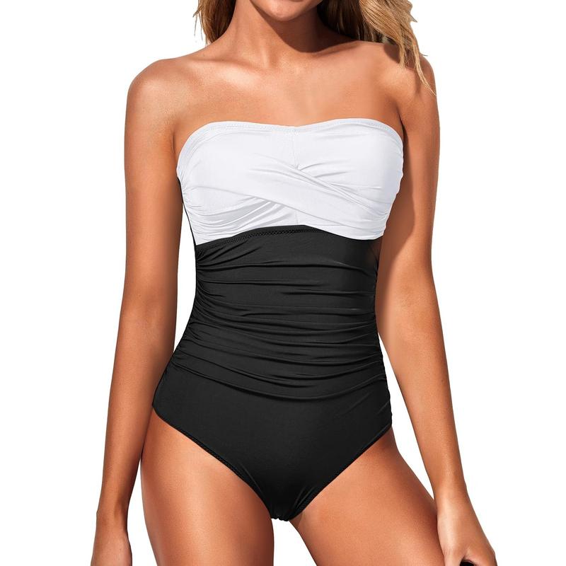 Yonique Womens Strapless One Piece Swimsuit Tummy Control Bandeau Bathing Suits Slimming Twist Front Swimwear for Beach Swimming Holiday Vacation