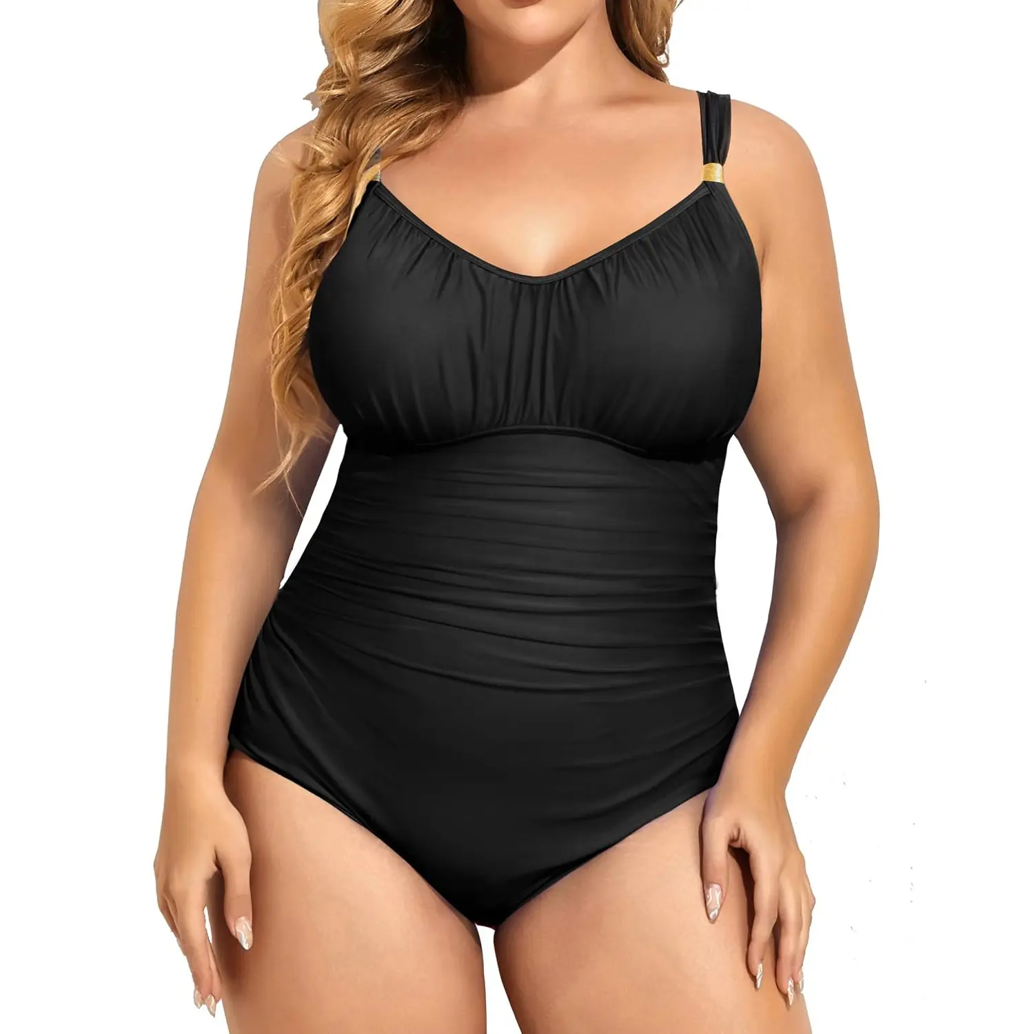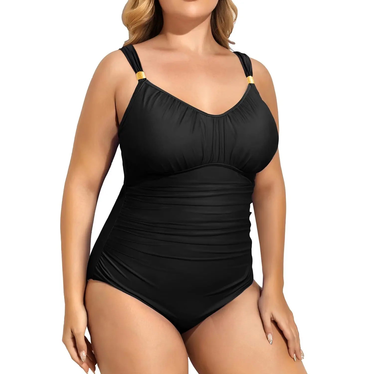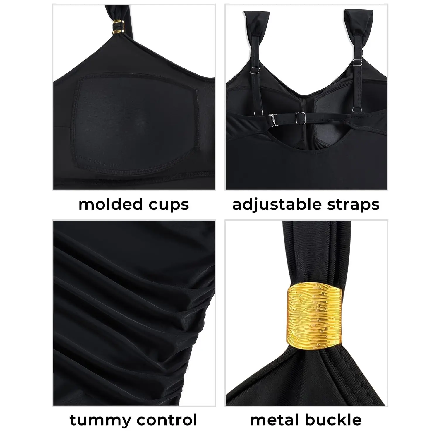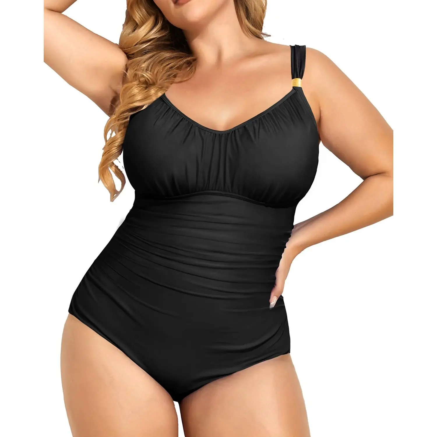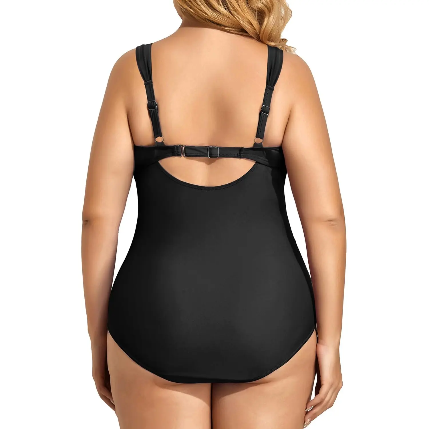 ·Plus Size Tummy Control Swimsuit: The ruched design can accentuate your curves and perfectly hide your tummy while still being flattering. The clasp hook closure on the back and molded cups provide enough bra support.