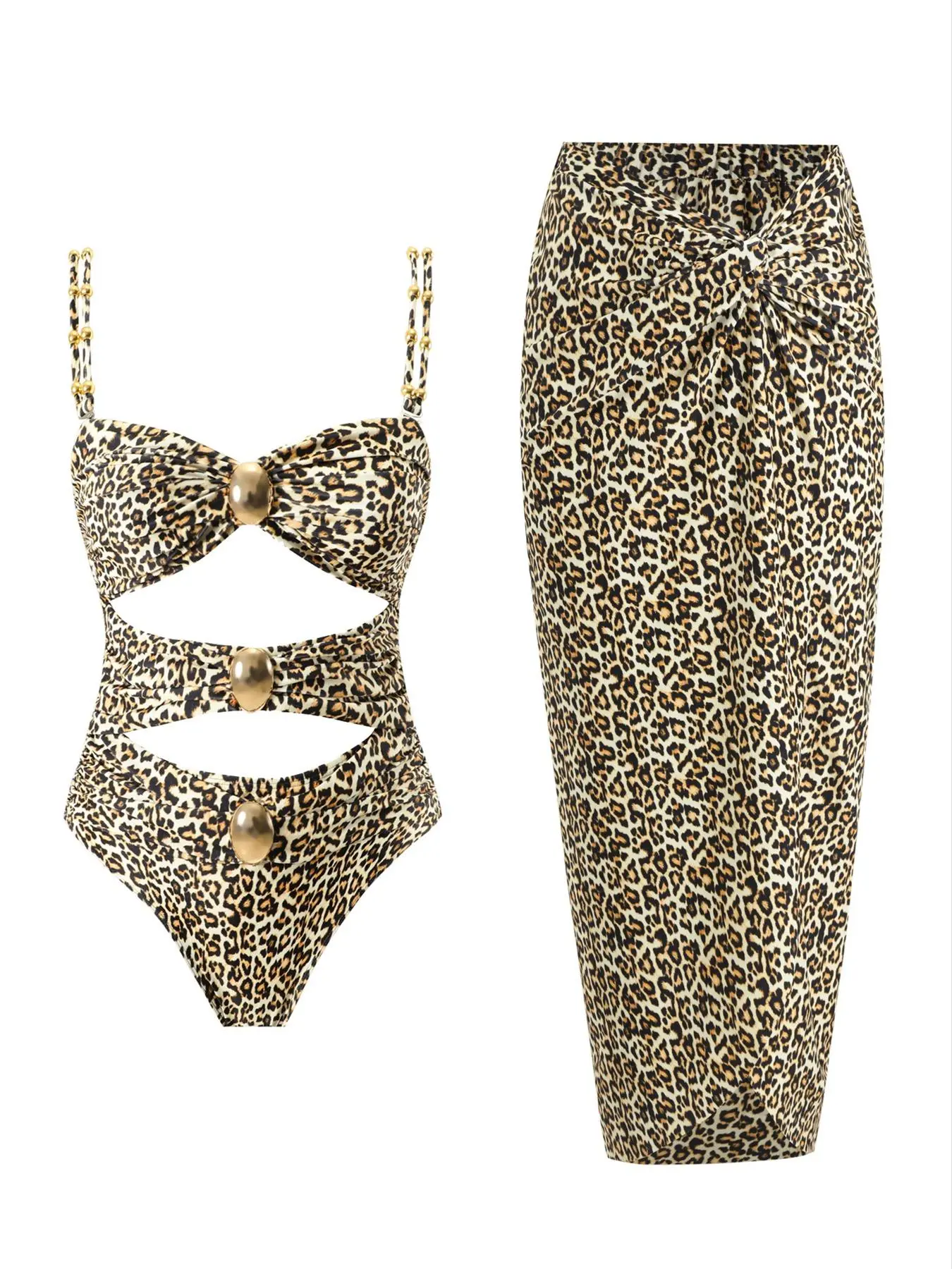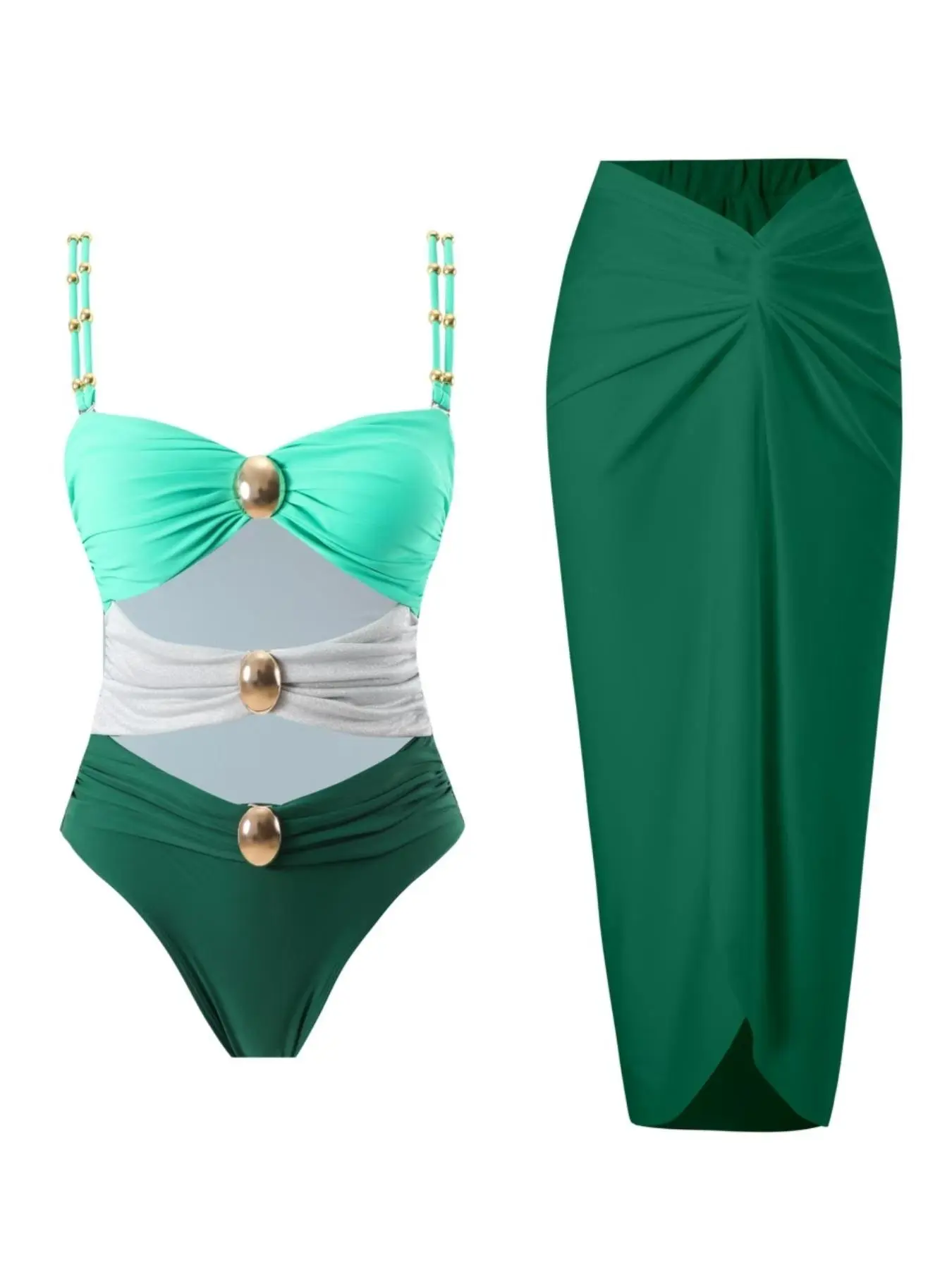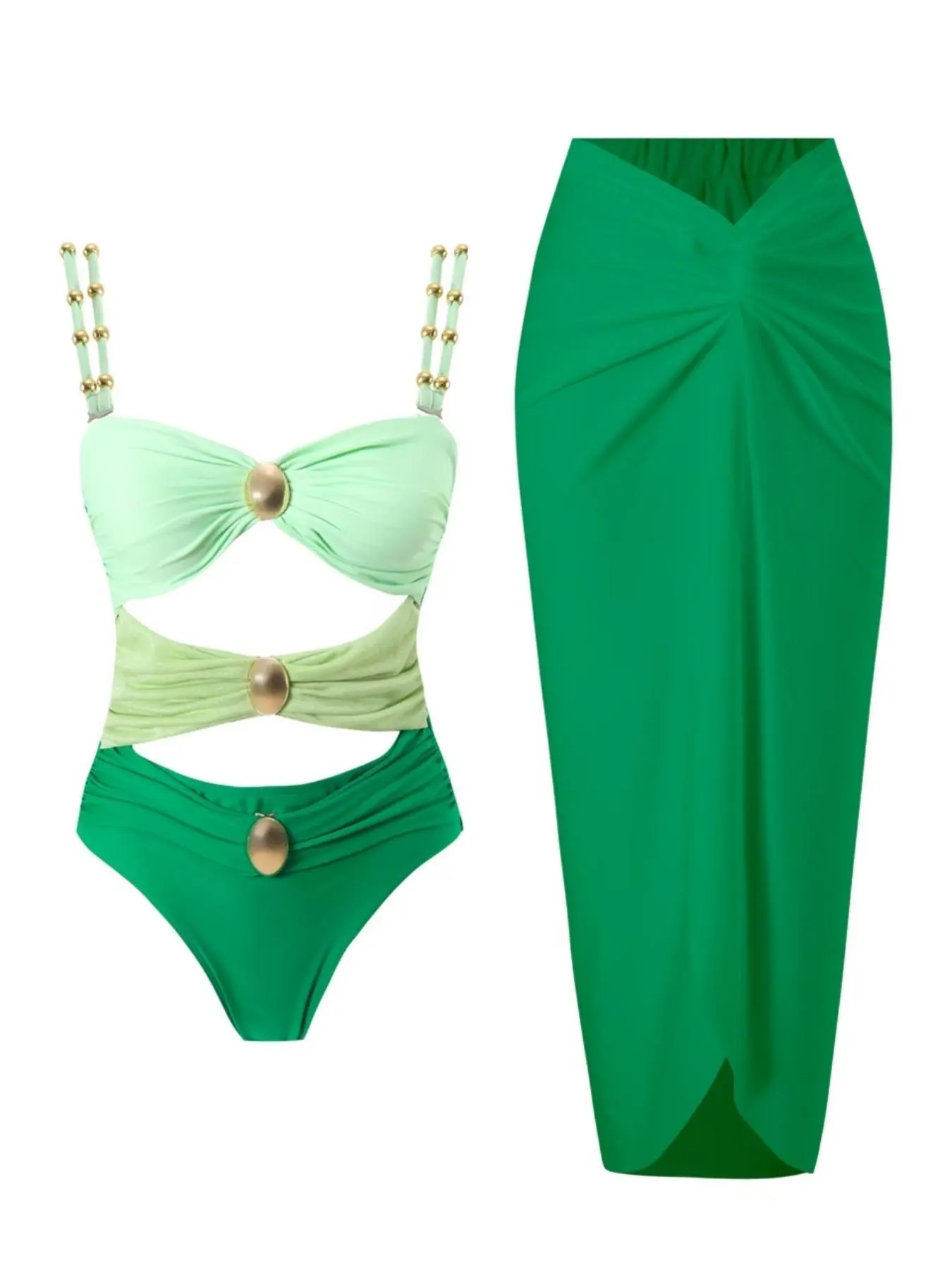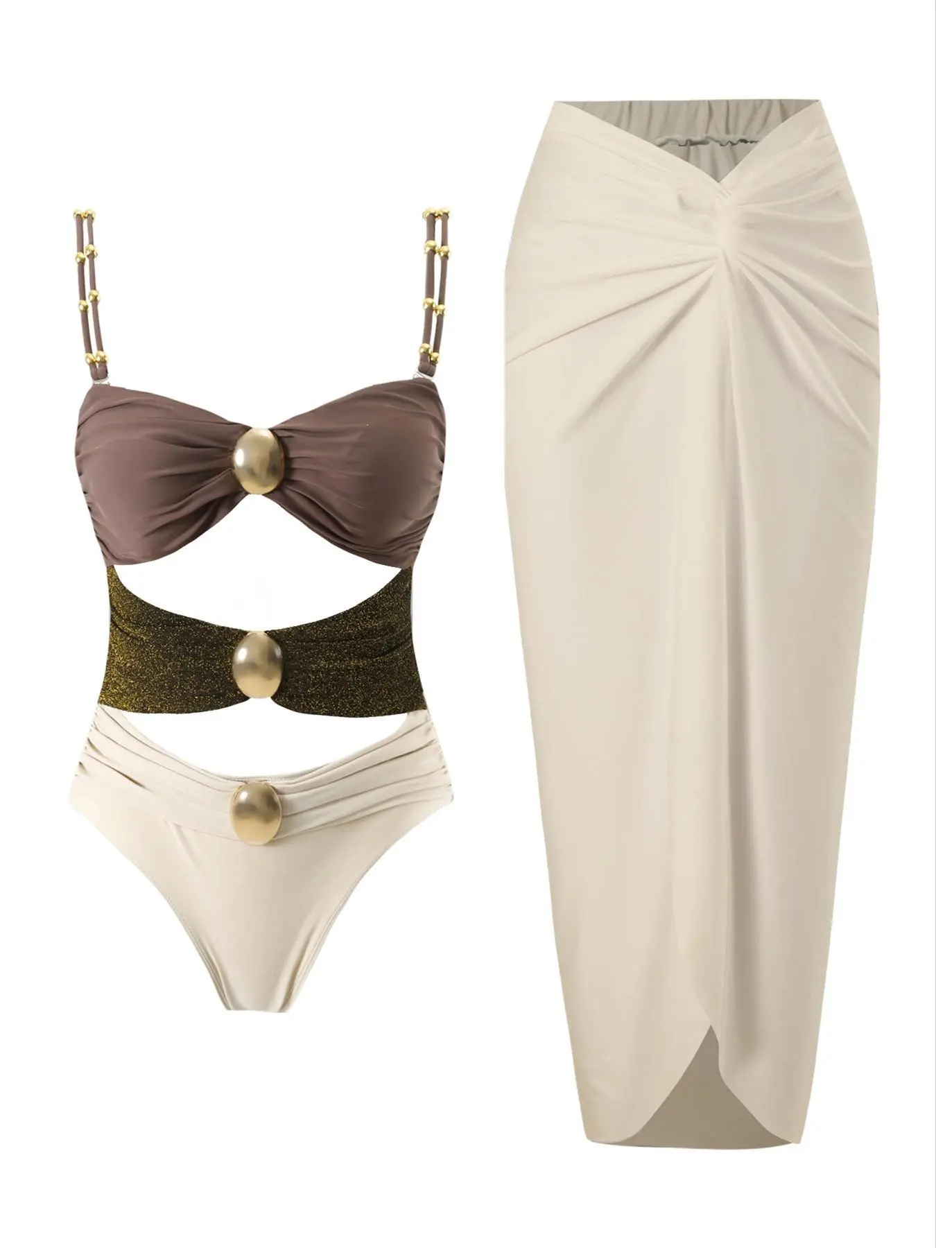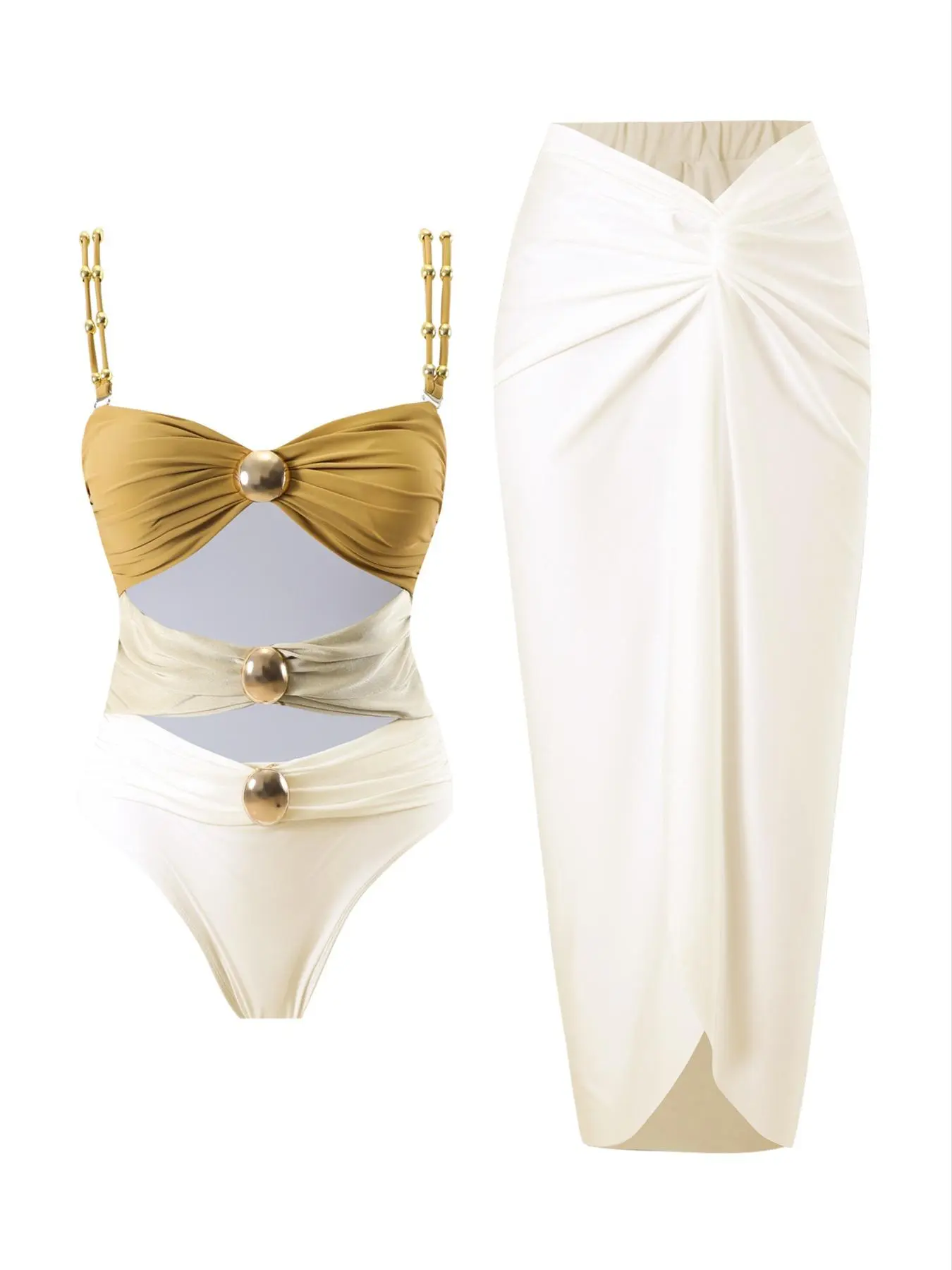 This bathing suit is everything. The gold details set it off and the openings give a great sex appeal, grown woman vibes for sure. The long cover up skirt has a slit and twist t the top, it is too cute. It will not disappoint.