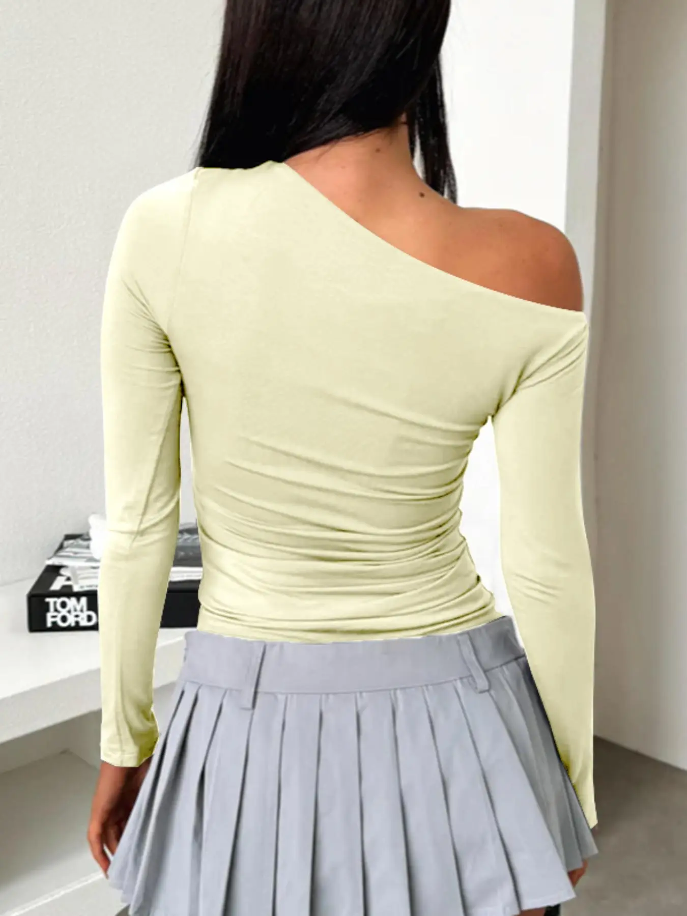 Women's Plain High Elasticity Asymmetrical Shoulder Slim Fit Long Sleeve Top #tiktokshopcybermonday #tiktokshopblackfriday #womens #ootd #fyp