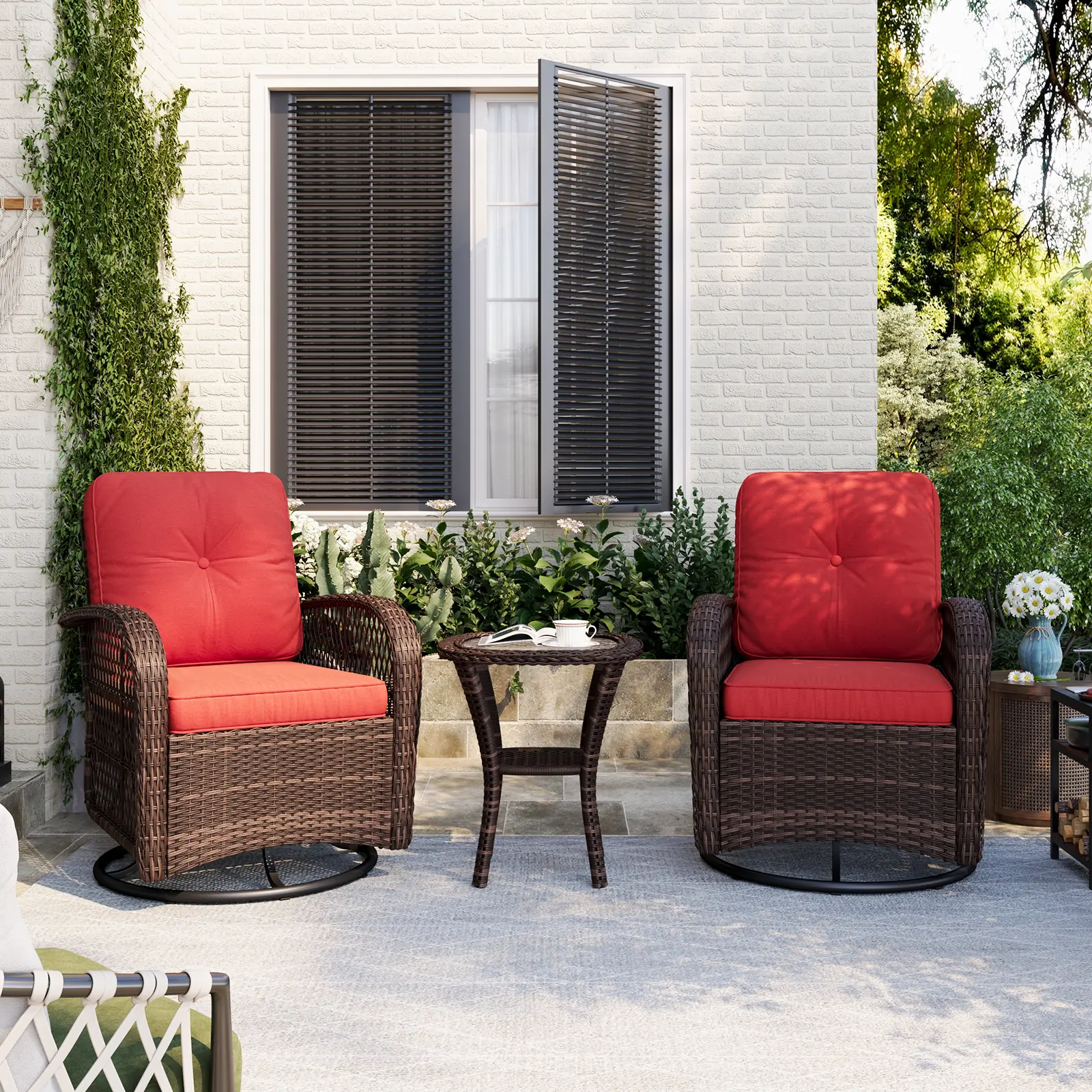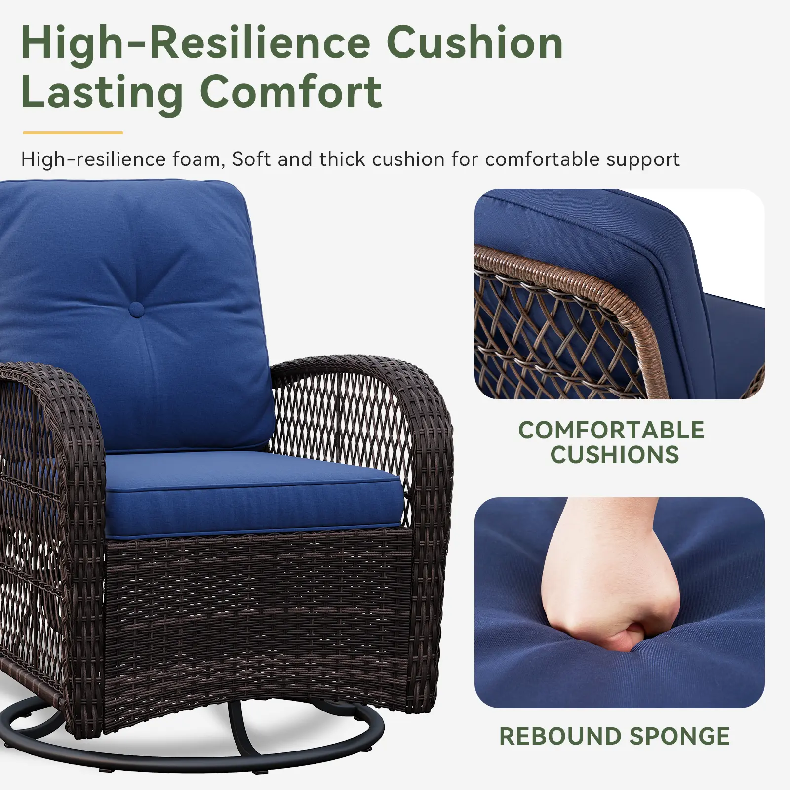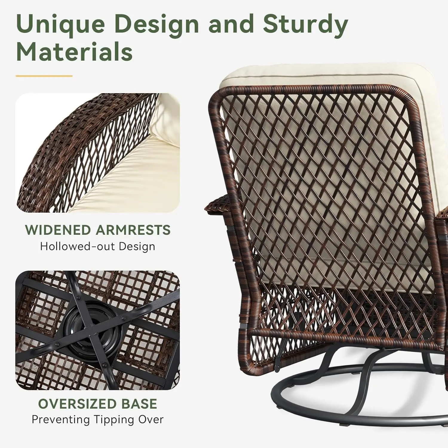 Sturdy metal frame with a round base lets you swivel freely and rock smoothly. Perfect for relaxing outdoors.