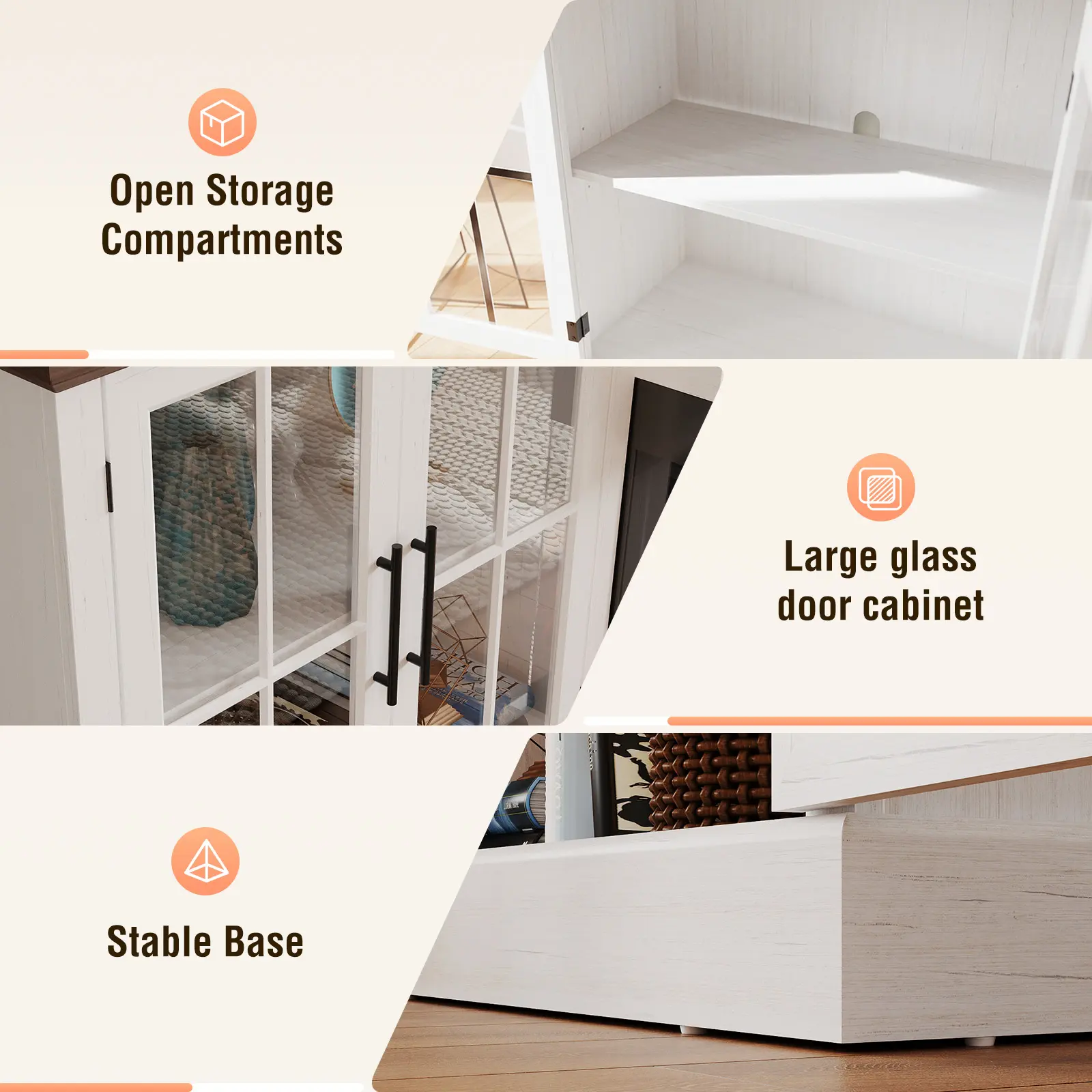 The entertainment center includes an open storage compartment for DVDs and two spacious glass-front cabinets. Two adjustable shelves allow you to customize the storage. Organize media, games, and other essentials with ease.