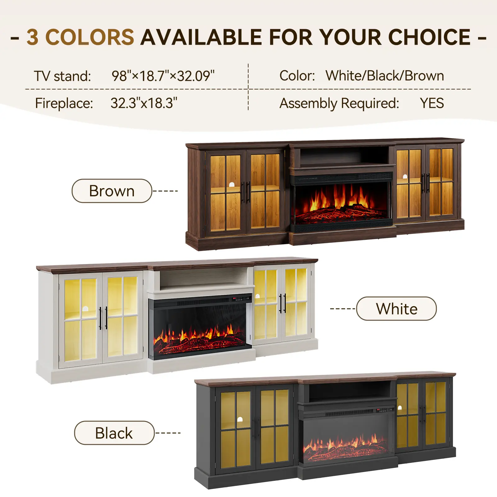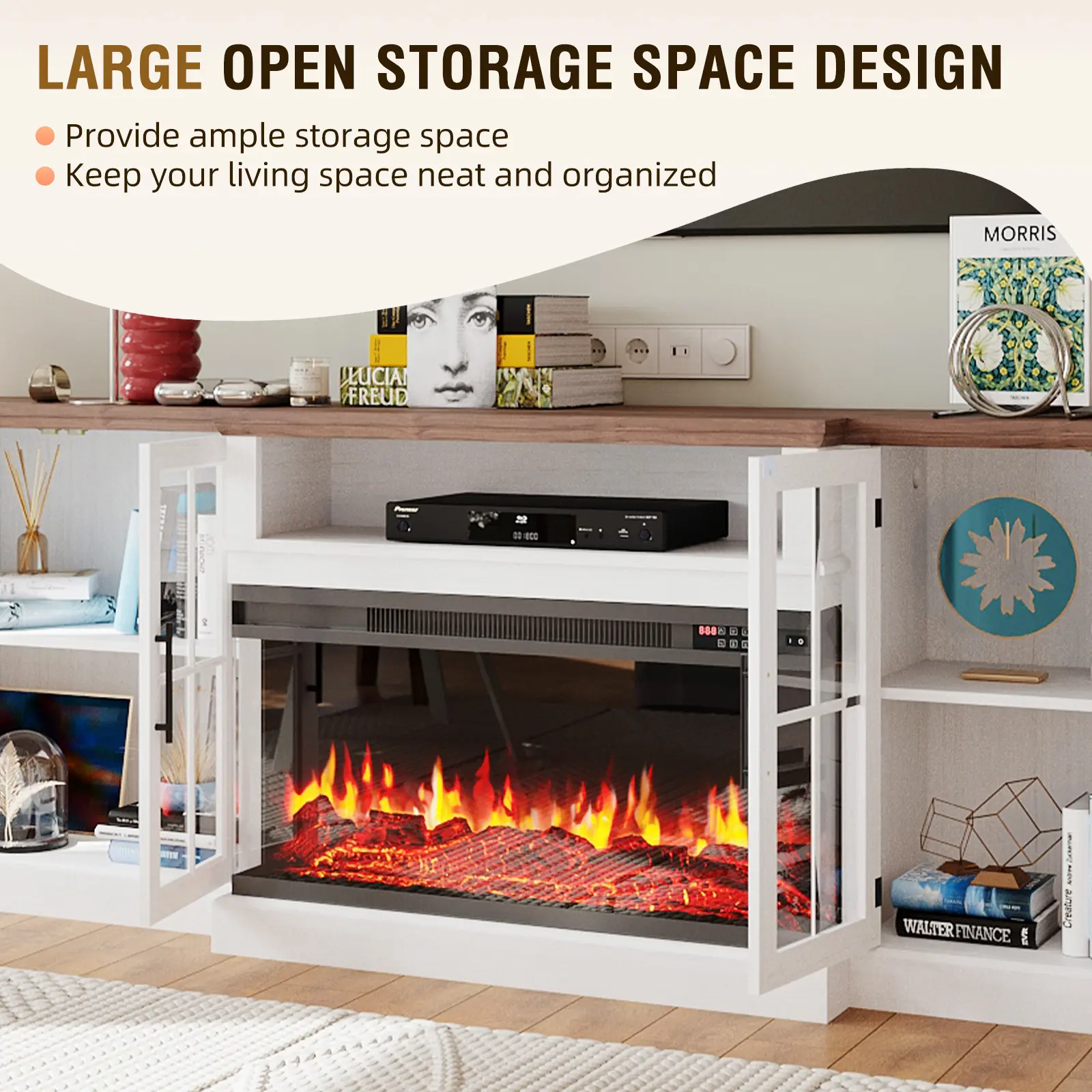 The fireplace TV stand offers a panoramic 180° view of flames from three sides. It has 5 flame brightness settings, 12 backlight colors, and 12 LED light strips. You can adjust the temperature from 60°F to 99°F and set the time from 0.5 to 9 hours. Enjoy a customizable fireplace experience.