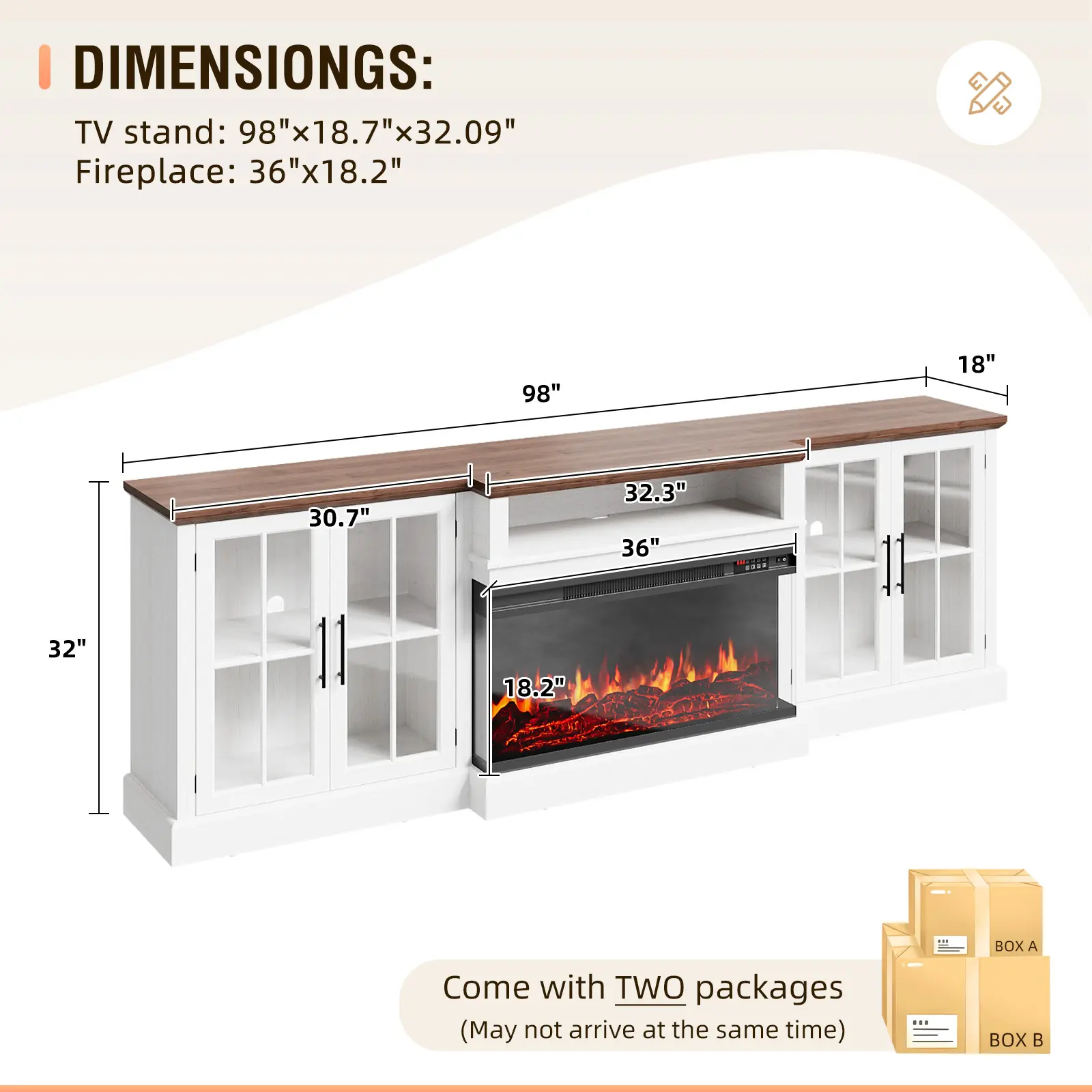 Illustrated instructions are provided for both TV cabinet and fireplace assembly. Installation is relatively easy. The product is packed in several packages and may arrive at different times.