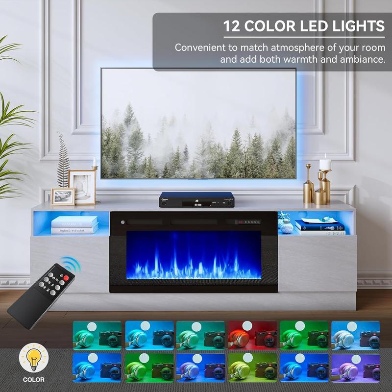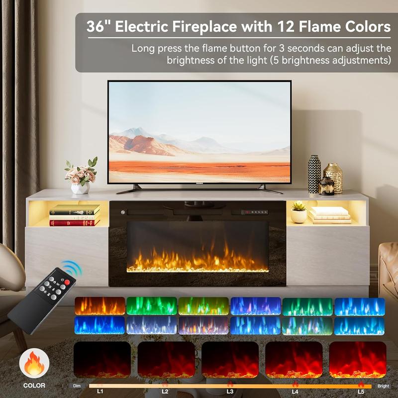 The oneinmil Fireplace TV Stand is a two-in-one solution for TVs up to 80". It features a 36" electric fireplace with customizable flame colors and dimmer. The stand is made of engineered wood with a modern wood grain finish. It offers stable viewing and is energy-efficient with LED flame technology. The stand is black and white, with a heat output of 5100 British Thermal Units.