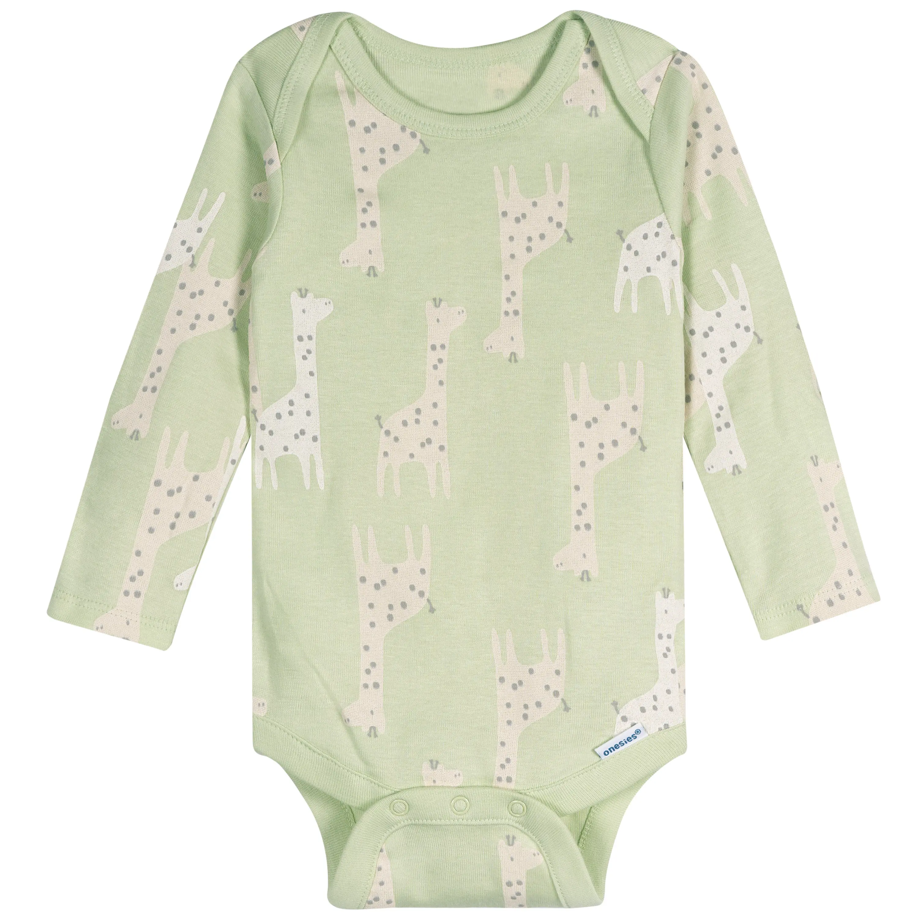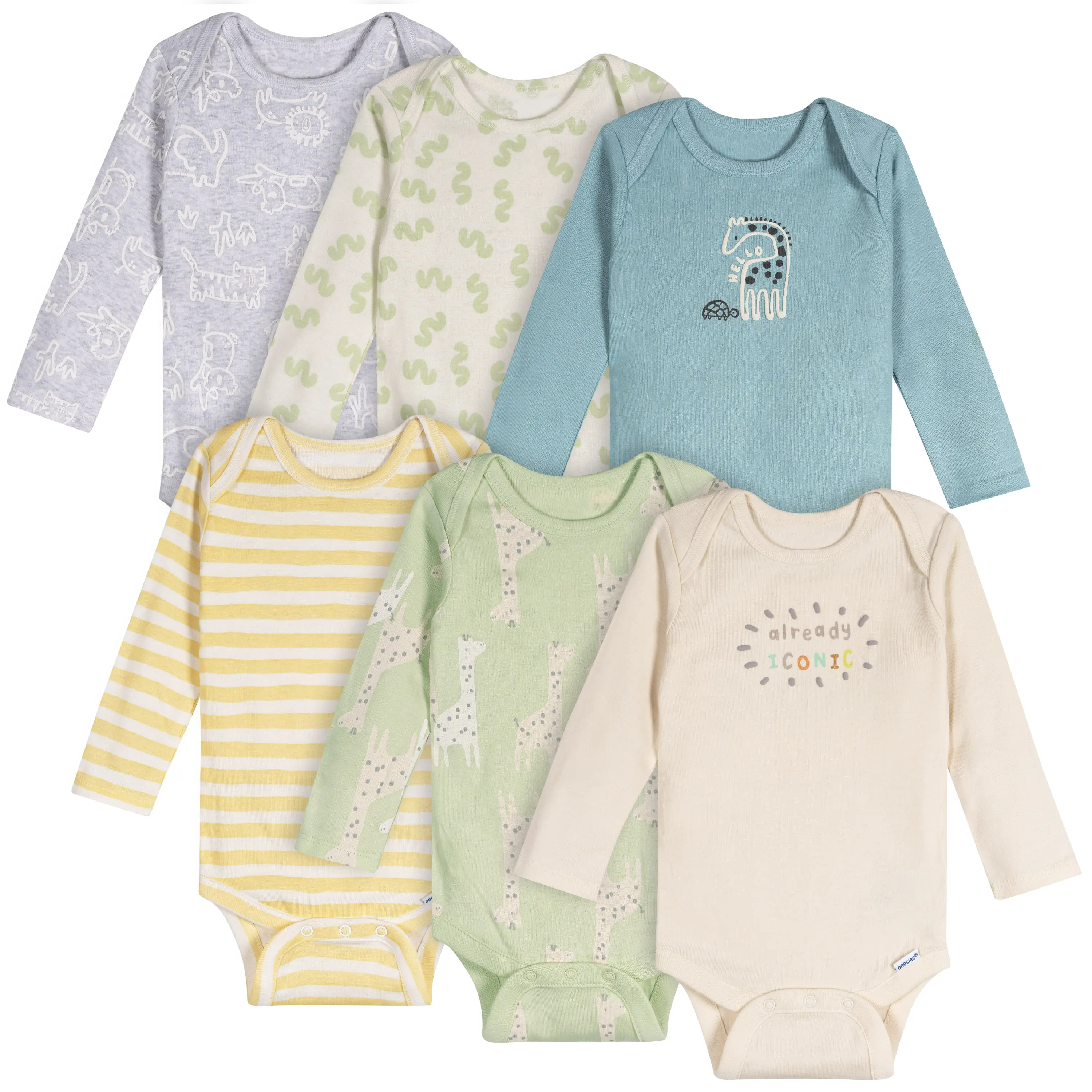 Give your baby's wardrobe a playful twist with this multipack set of six long sleeve gender-neutral Onesies® bodysuits, featuring an adorable giraffe theme! Perfect for the cooler fall and winter months, these bodysuits are made from 100% cotton, ensuring a soft and gentle touch against your baby's sensitive skin. The set includes a variety of colors and charming prints, making these bodysuits easy to mix and match with other outfits, and perfect for everyday wear. Designed with simple leg snaps for quick diaper changes and an expandable lap-shoulder neckline for easy removal, these bodysuits offer both style and convenience. The comfort-stretch ribbing at the neckline and leg holes provides a flexible, snug fit that moves with your baby. Whether you're stocking up on essentials or looking for a thoughtful baby shower gift, this set is a fantastic choice for any new parent! Our essentials have been independently certified with STANDARD 100 by OEKO-TEX® so that you don’t have to worry about harmful substances in your wardrobe. Pack includes 6 bodysuits.