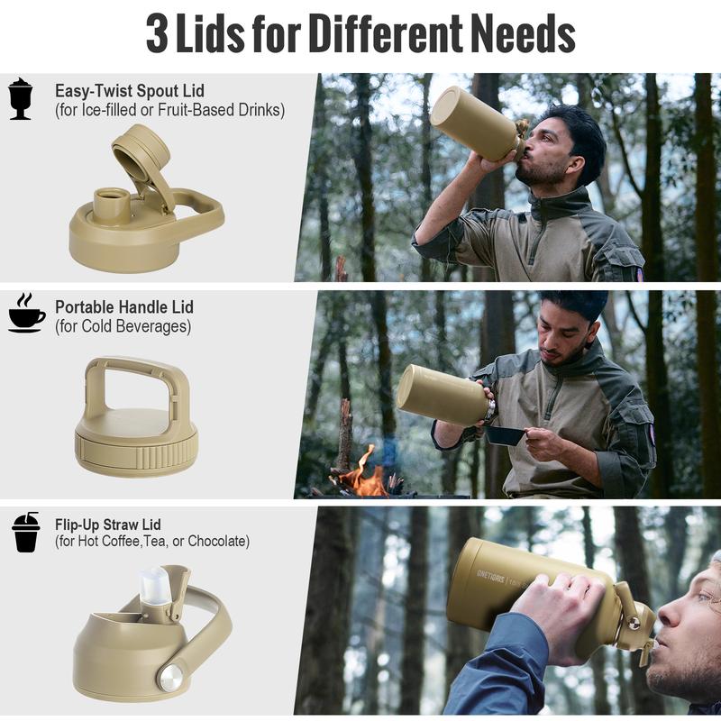 This OneTigris 64oz steel bottle gets the job done. Stays cold forever, doesn’t leak, and the pouch is handy. Swap lids for straw or chug—works for gym or trail. Solid buy if you need a big, tough bottle.