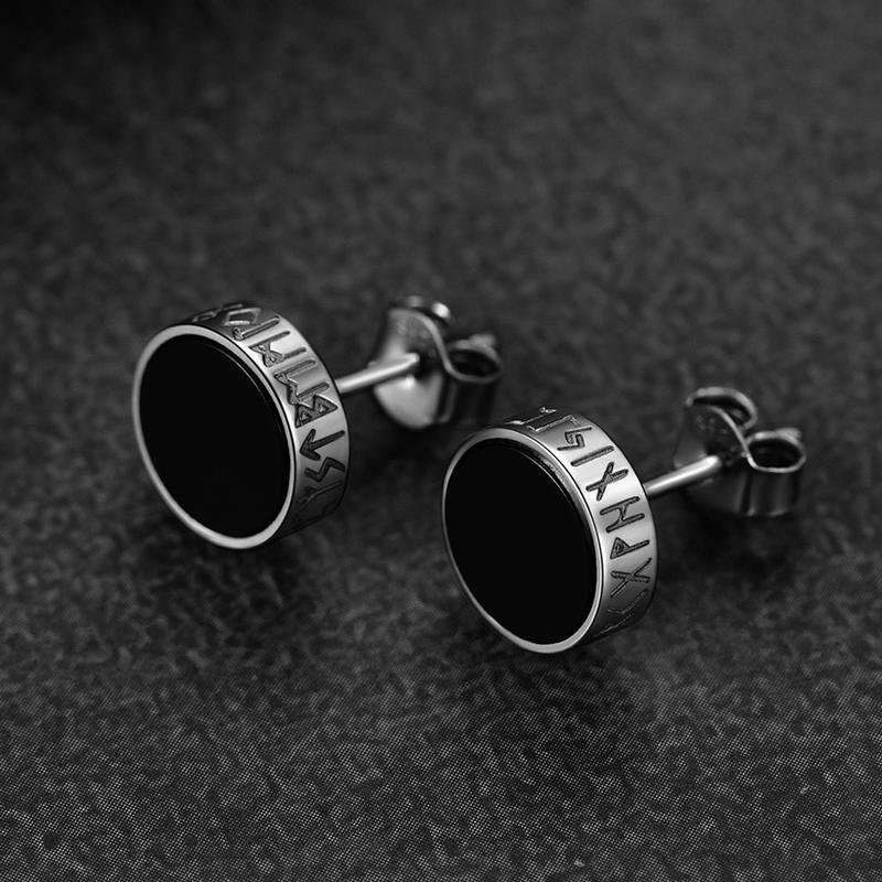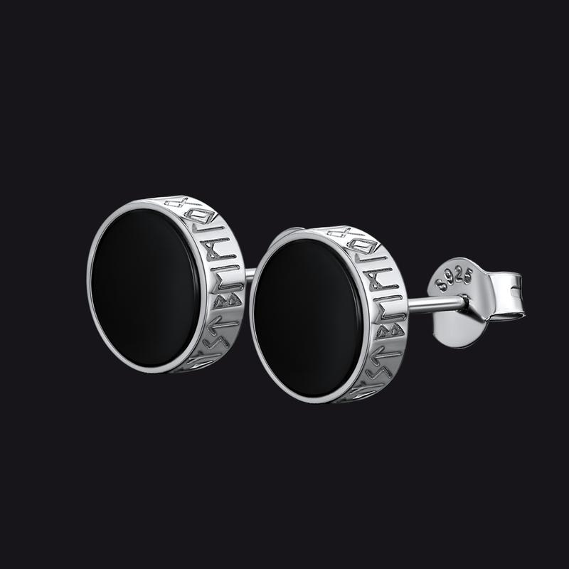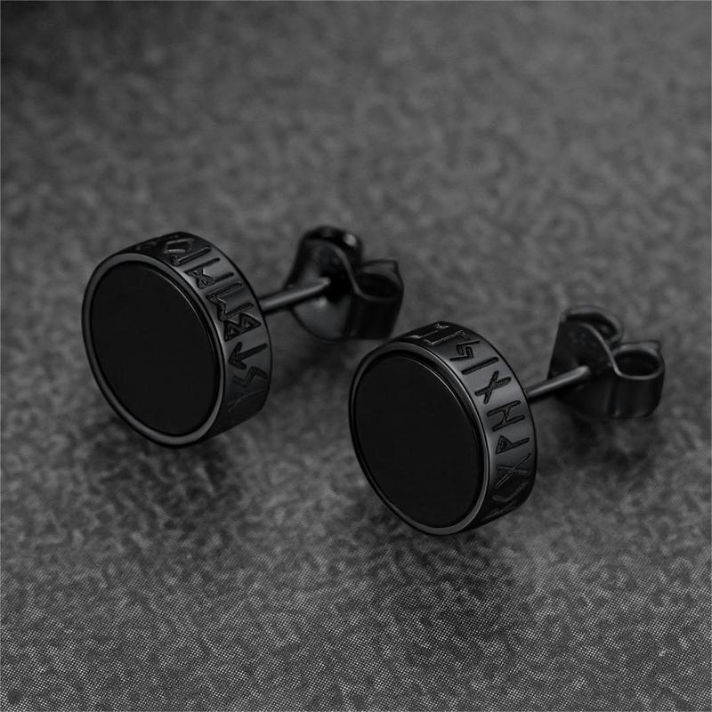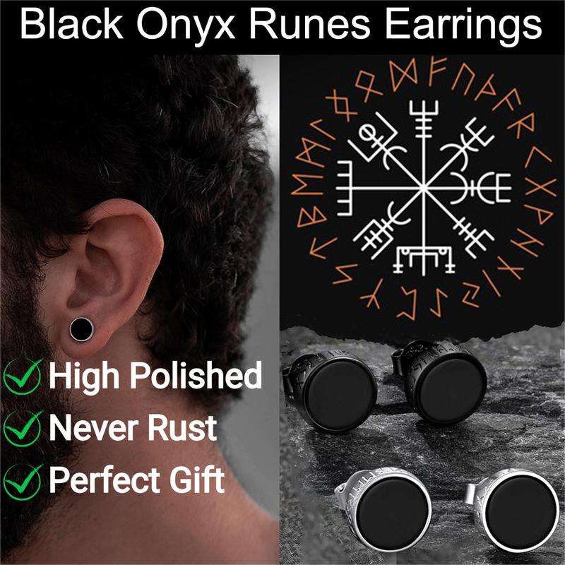 FaithHeart Black Onyx Stud Earrings with Viking Runes For Men Women