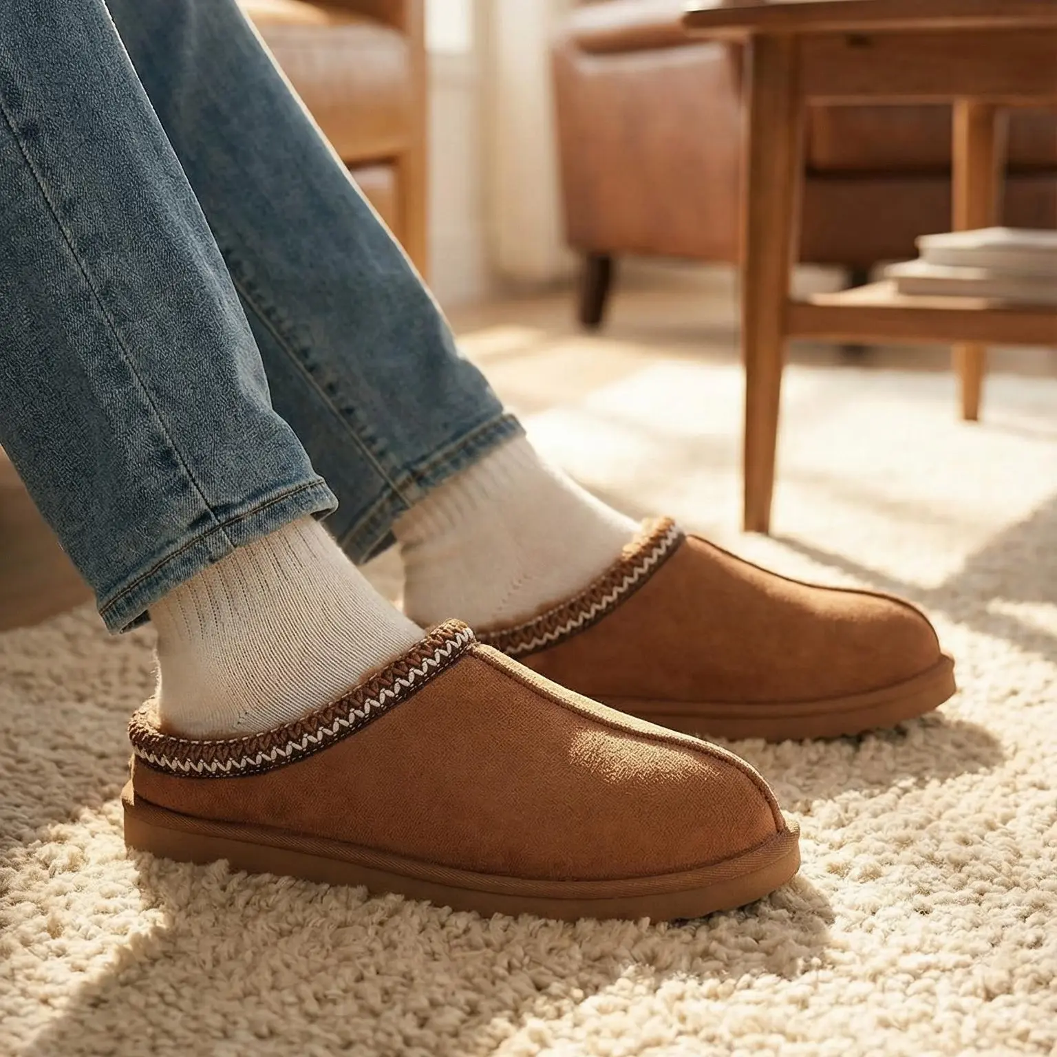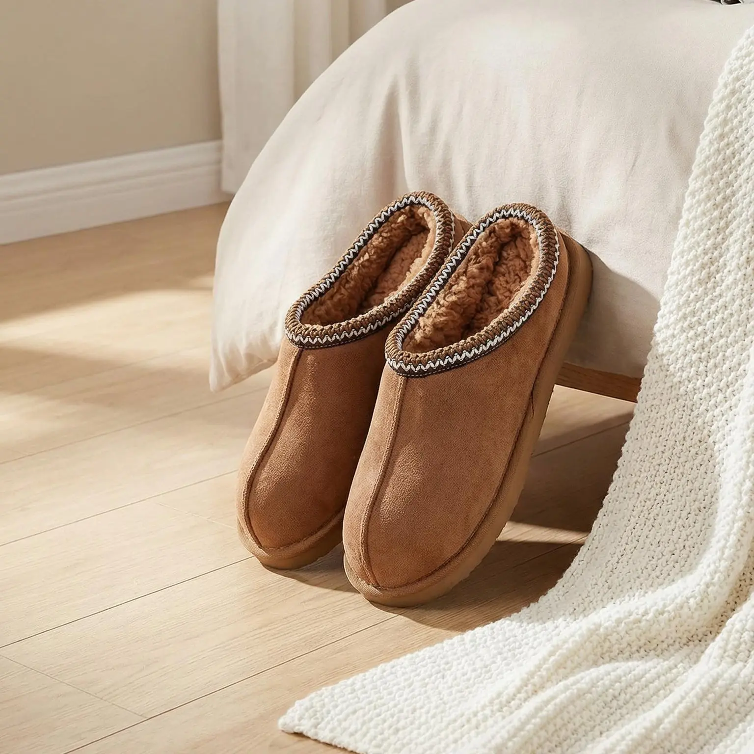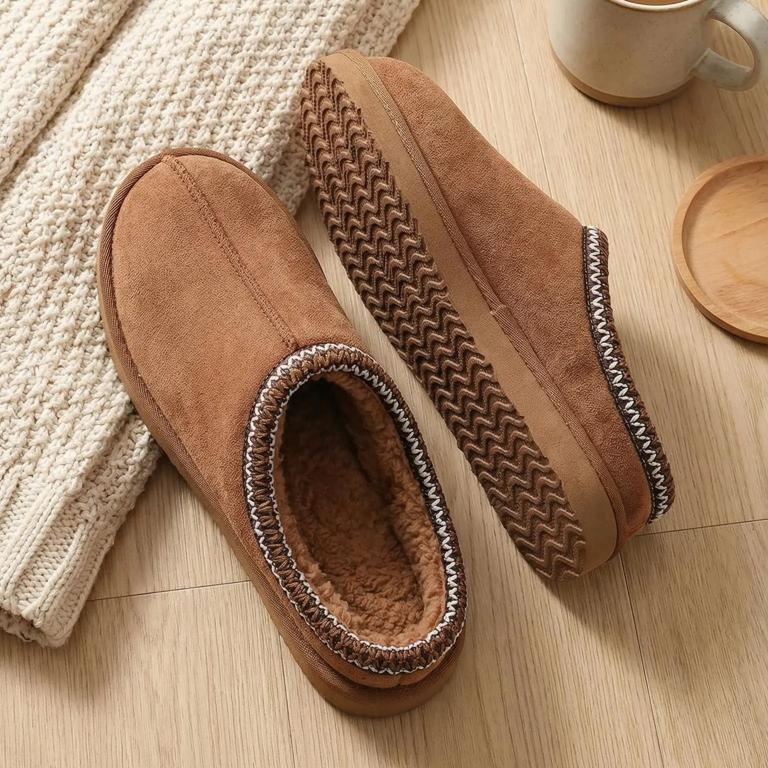 ¡Chestnut Classic Decor: The slippers come in a chestnut color with classic decorative stitching.