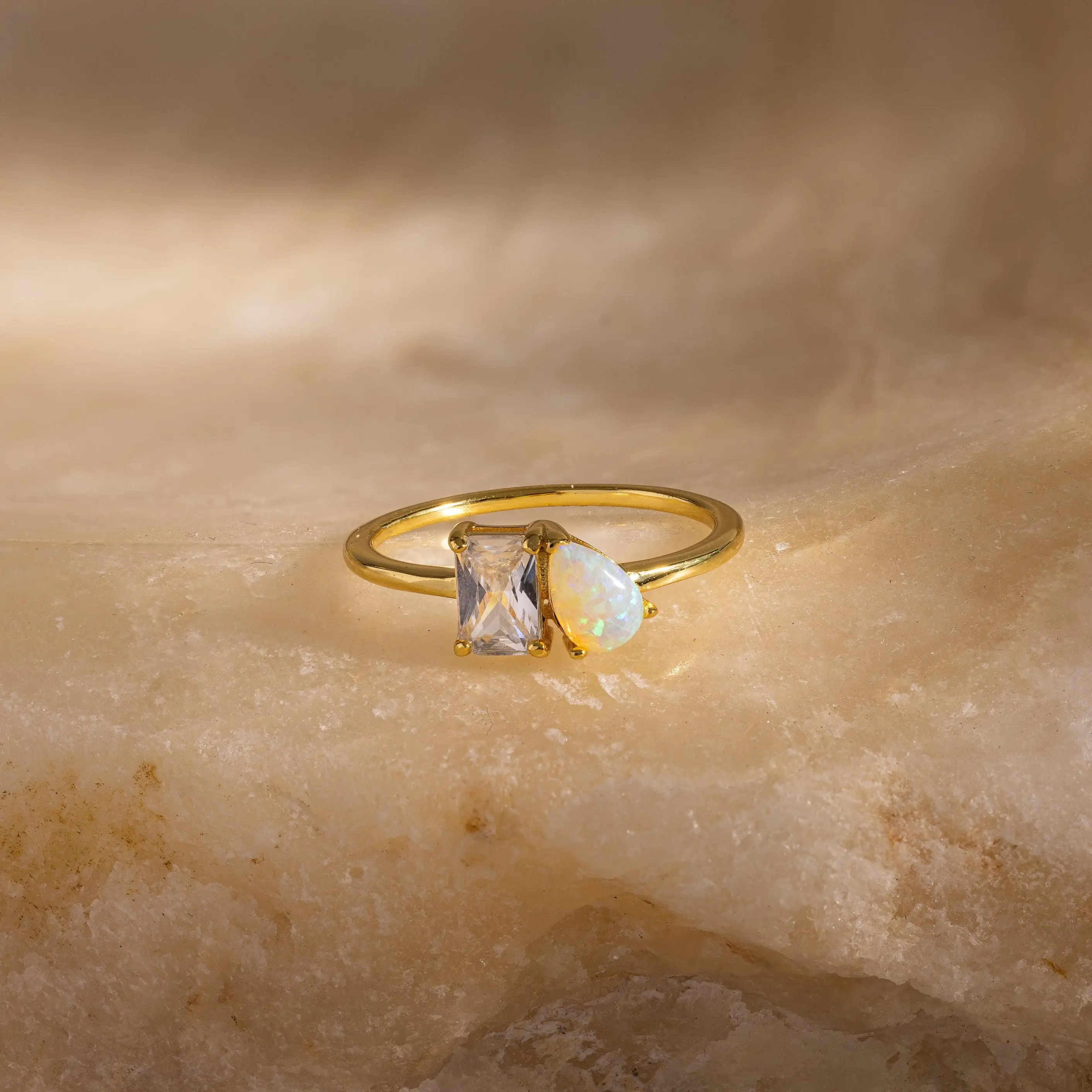 A romantic take on the toi et moi style, our Opal Diamond Toi et Moi Ring pairs a pear shaped opal with an emerald cut diamond stone in perfect harmony. Symbolizing two souls intertwined, it’s a piece made for meaningful moments ✨