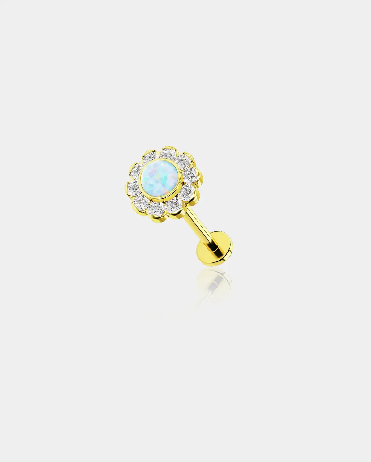 This delicateflat back titanium labret studprovides an elegant, sparkly look for everyone who put it on. It features a flower, a white opal inserted as flower stamen, and many shiny clear accents paved around the opal as petals, a really gorgeous flower. Get a look for your labret piercing that screams luxury without depleting your savings with this trendy and popular design!