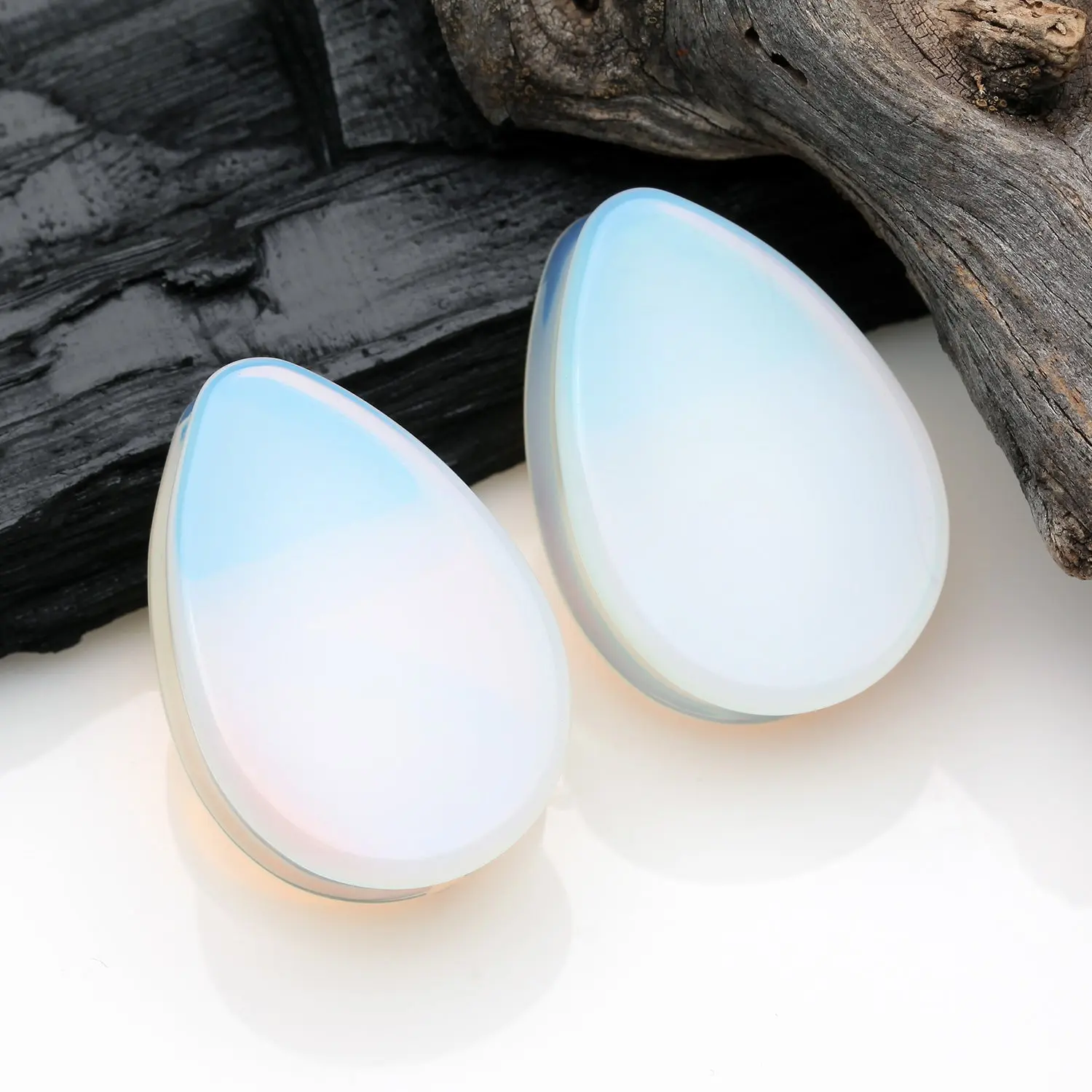 A Pair of Opalite Stone Teardrop Double Flared Ear Gauge Plug