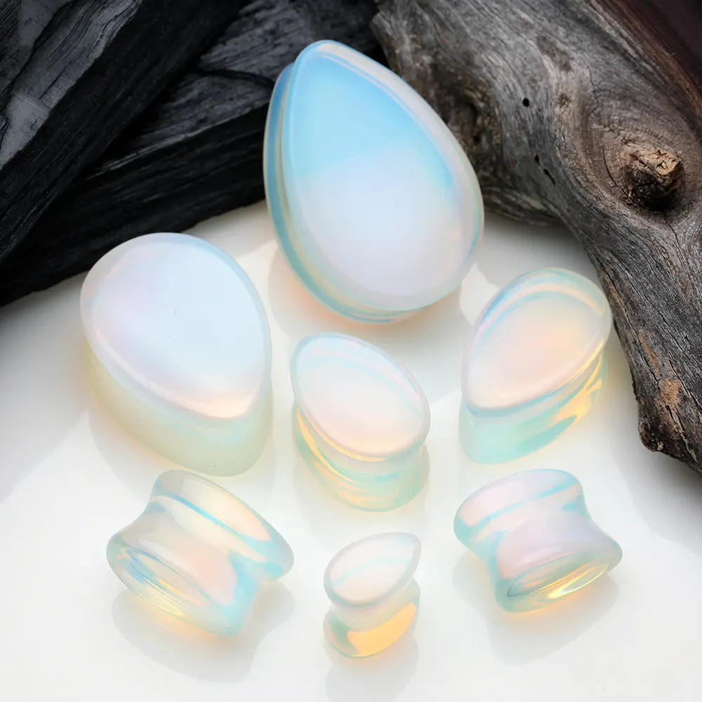 Illuminate your lobes with this pair of opalite double-flared ear plugs! These teardrop shaped beauties have a unique and mystical look that's perfect for those who like to make a fierce fashion statement. With their standout sparkle, these plugs will help you stand out from the crowd. Get your ear game lit!