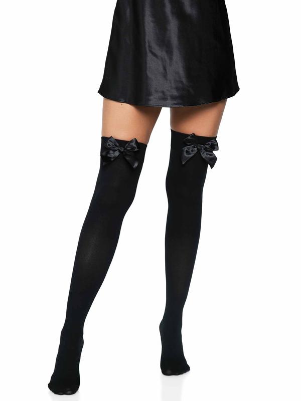 Let your legs do the talking in the Kay Opaque Thigh Highs by Leg Avenue. This absolutely stunning pair of women's stockings features and ultra-flattering, snug fit topped with a beautiful satin bow. Pair with your favorite sexy lingerie for an unforgettable look!