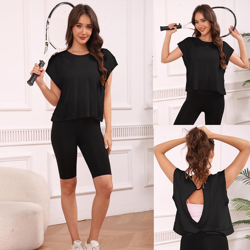 ·Feature: The open back tee for women is trendy and comfy, perfect for daily wear. This athletic tee shirts features a relaxed fit, a timeless wide neckline, slight crop,as well as open-cut back and ribbed wrist detail, all of which contribute to an elegant and cute look.