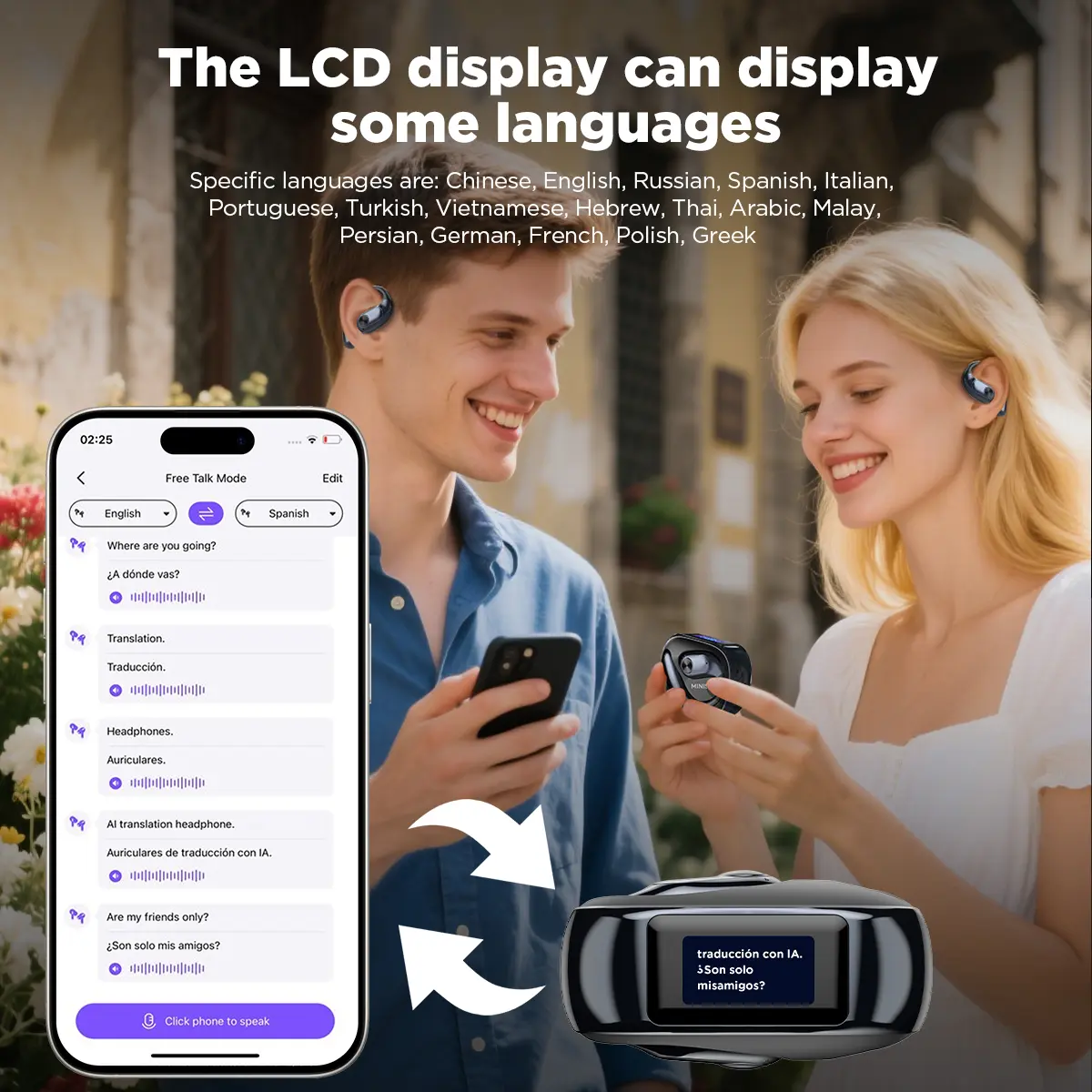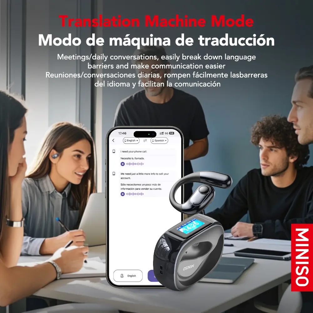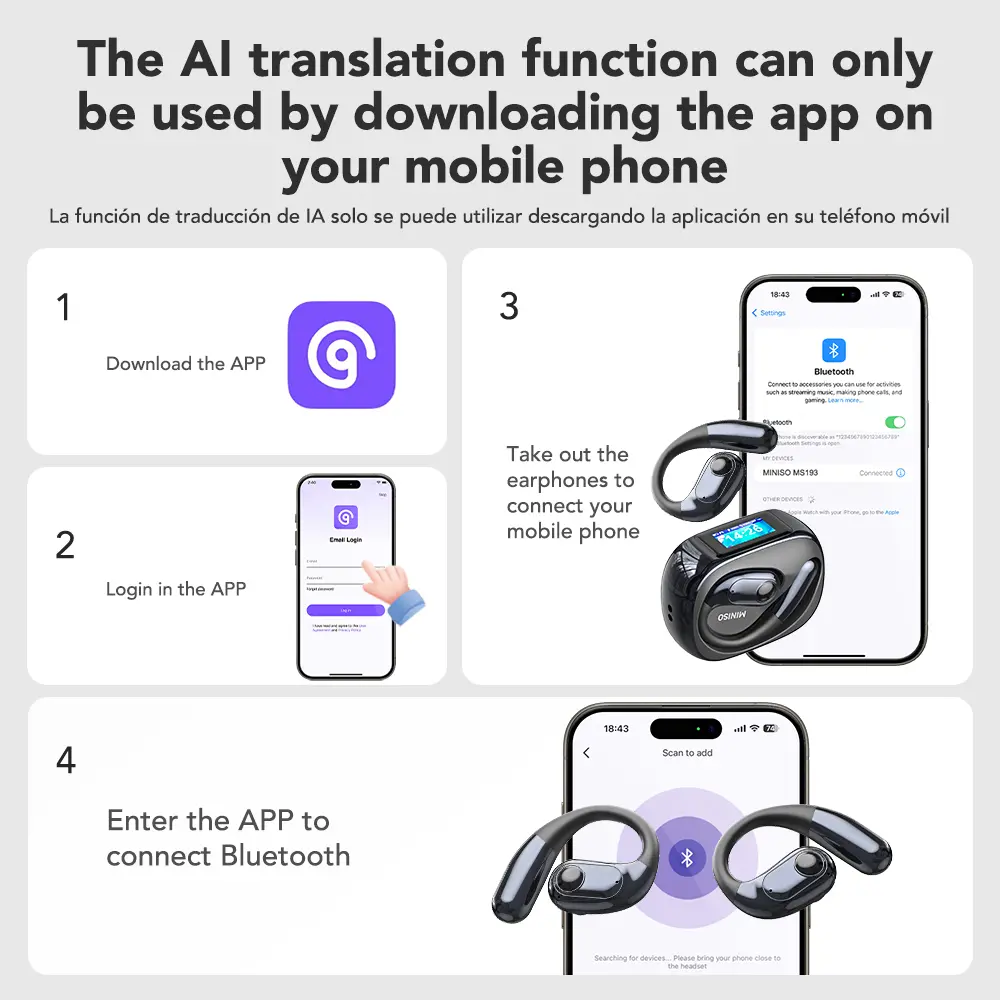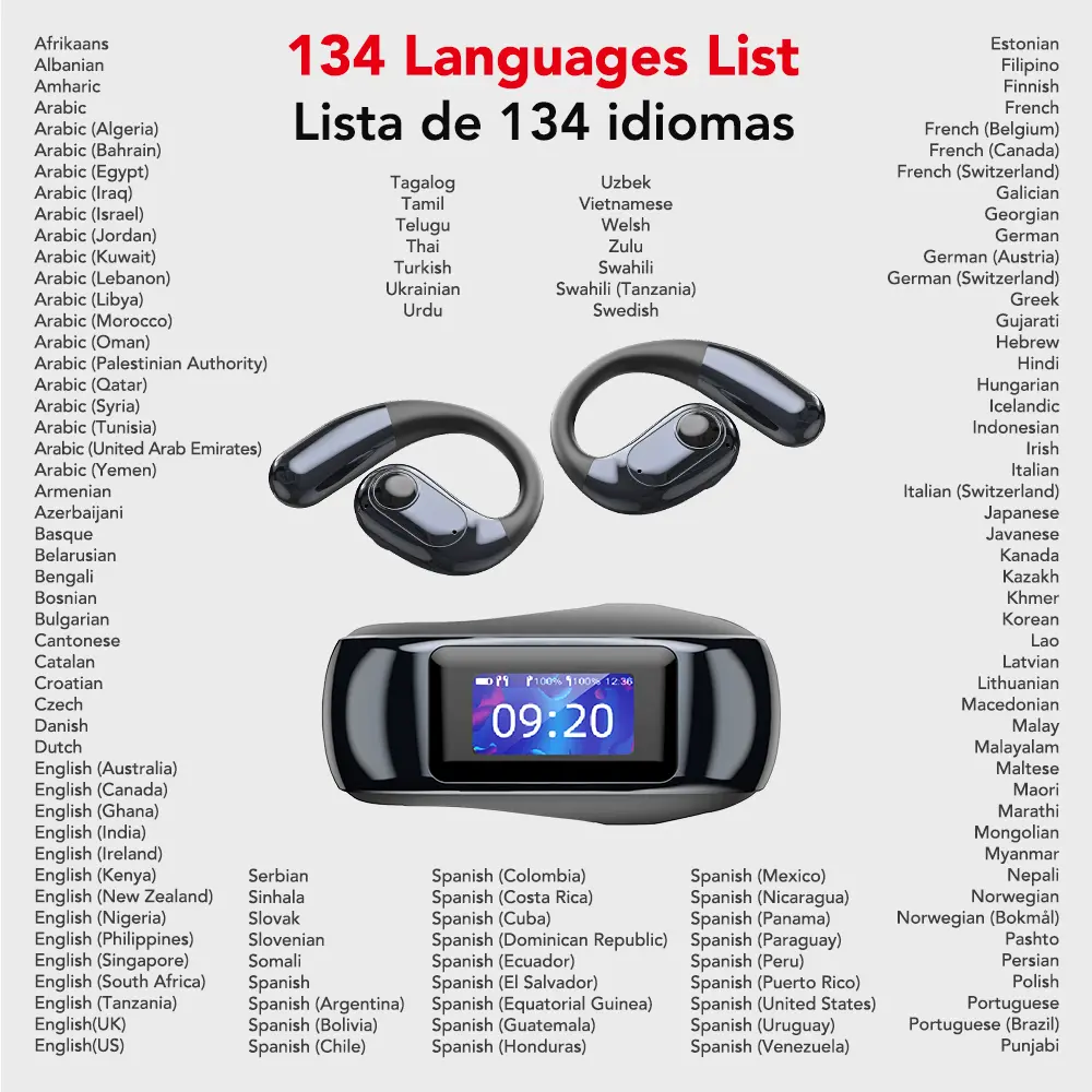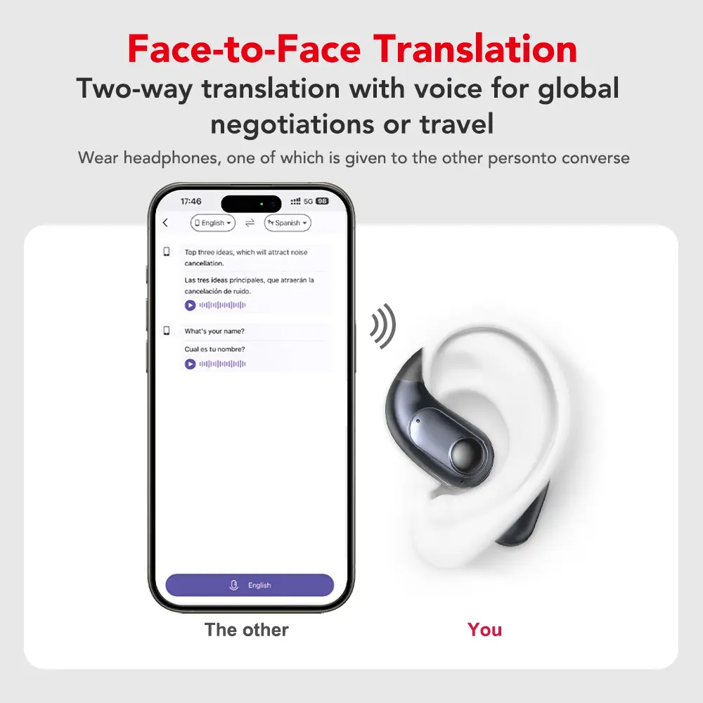 ·Function 1:AI Binaural Translation(The translated text will be displayed on the headset screen)(The headset screen can clearly display the corresponding language of the text: Chinese, English, Russian, Spanish, Italian, Portuguese, Turkish, Vietnamese, Hebrew, Thai, Arabic, Malay, Persian, German, French, Polish, Greek)