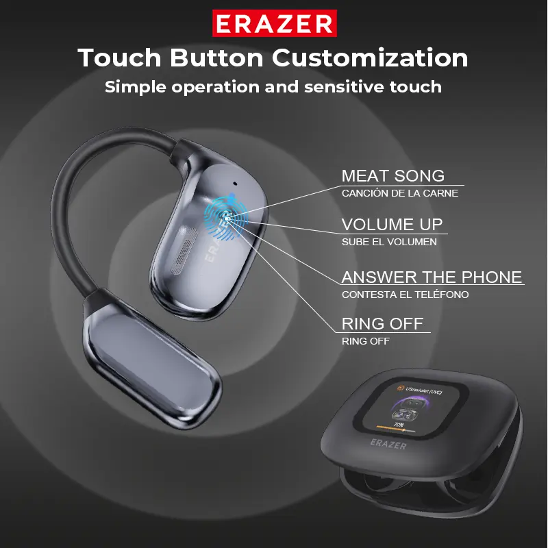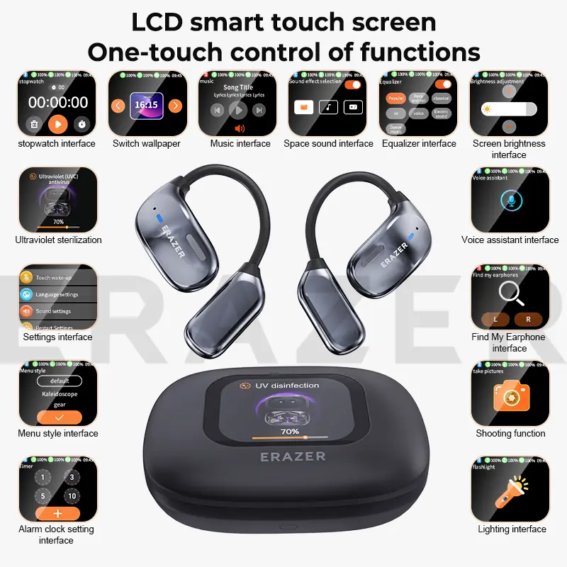 3.. LCD full-color smart screen multi-function touch headset, precise control of mobile phone music playback/switching, full support for volume adjustment, EQ sound effects with multiple options, mobile phone shooting function,Light Brightness Color Adjustment,etc.