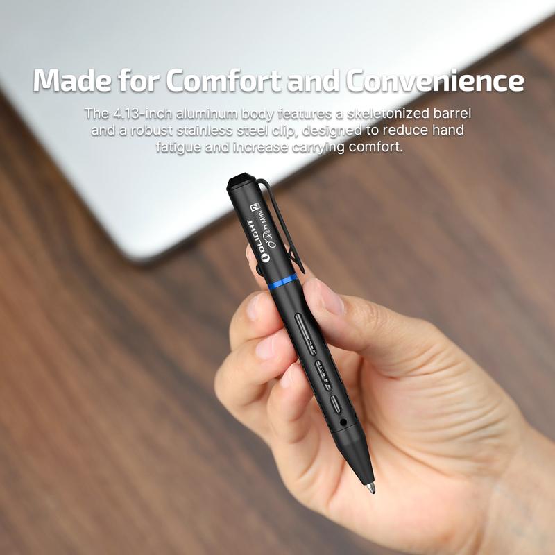 The pen is a great size for keeping on you all the time. Having a pen and pencil is a plus. The bolt action feature is a little cumbersome. It's obviously not as quick as a click type pen. Takes some getting use to. Olight has really good products.