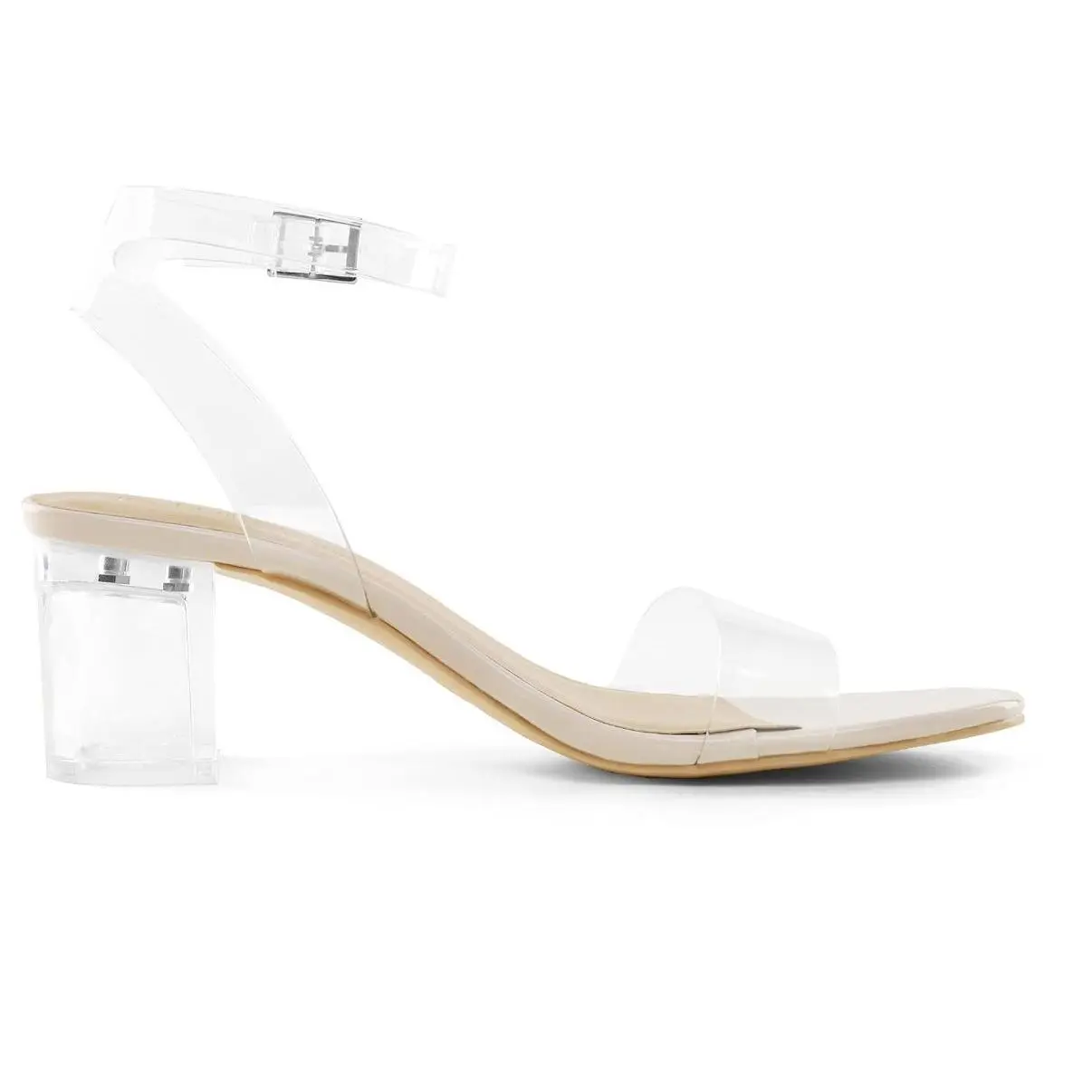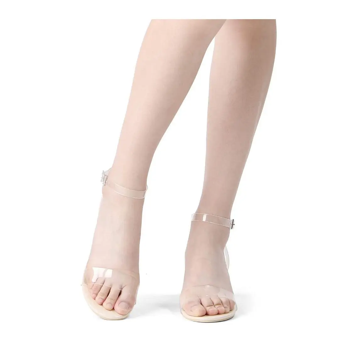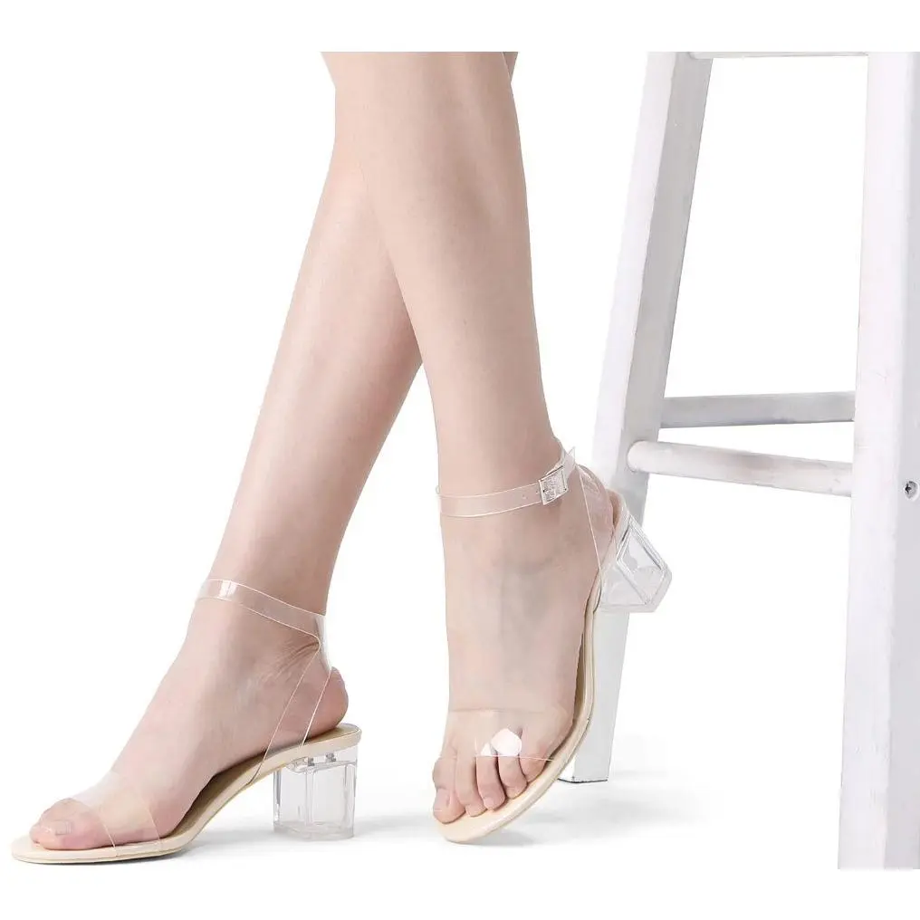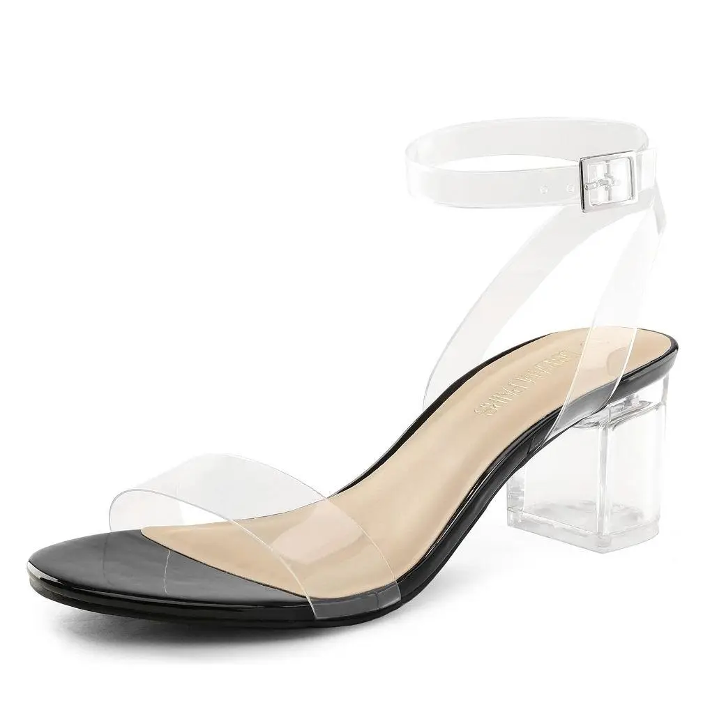 ·Transparent upper, ankle strap with adjustable buckle closure, rounded open toe, closed heel