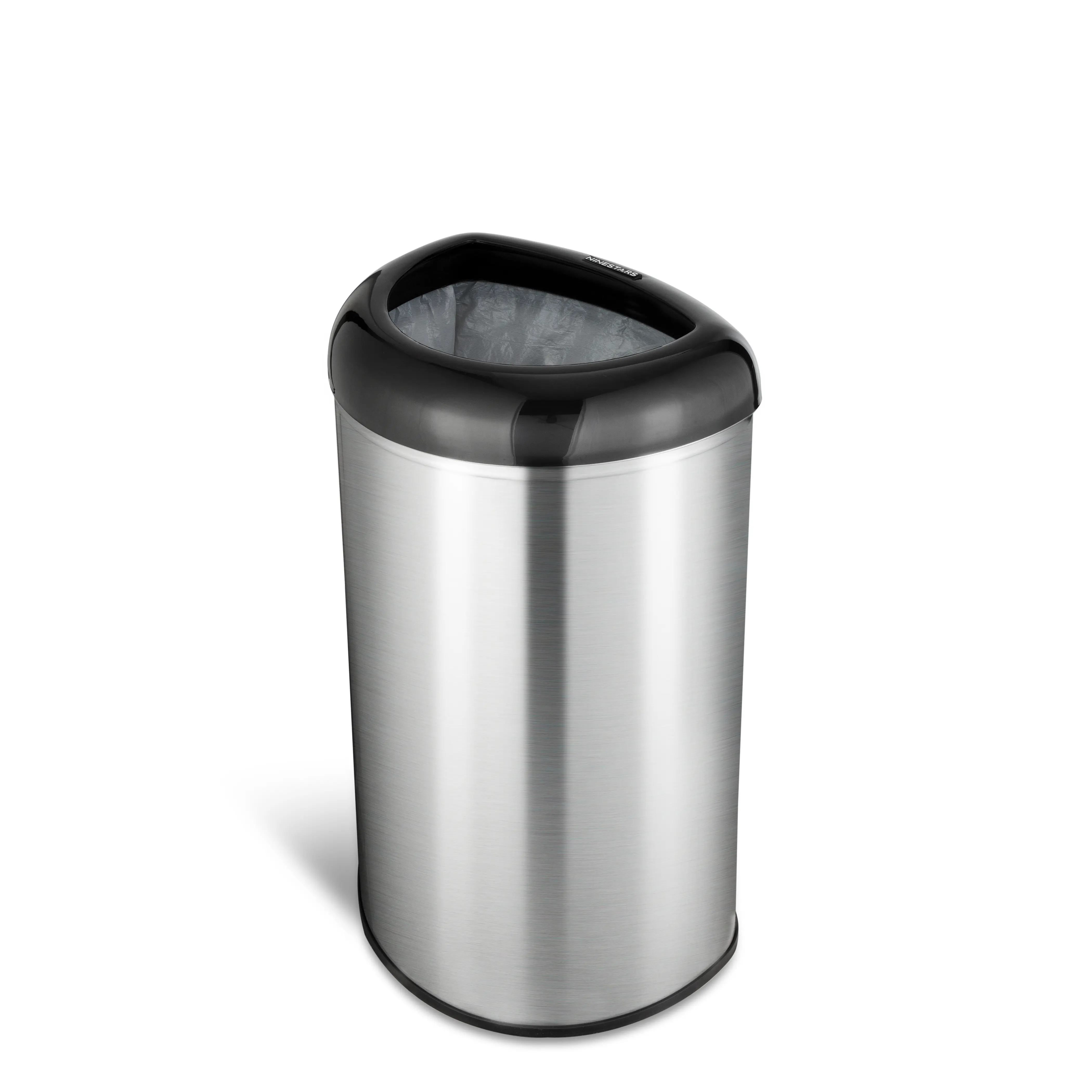5. NINESTARS AMZ-OTT-50-19BK Open Top Office Bathroom Trash Can, 13 Gal 50L, Stainless Steel Base Garbage Bin (D Shape, Black Lid)