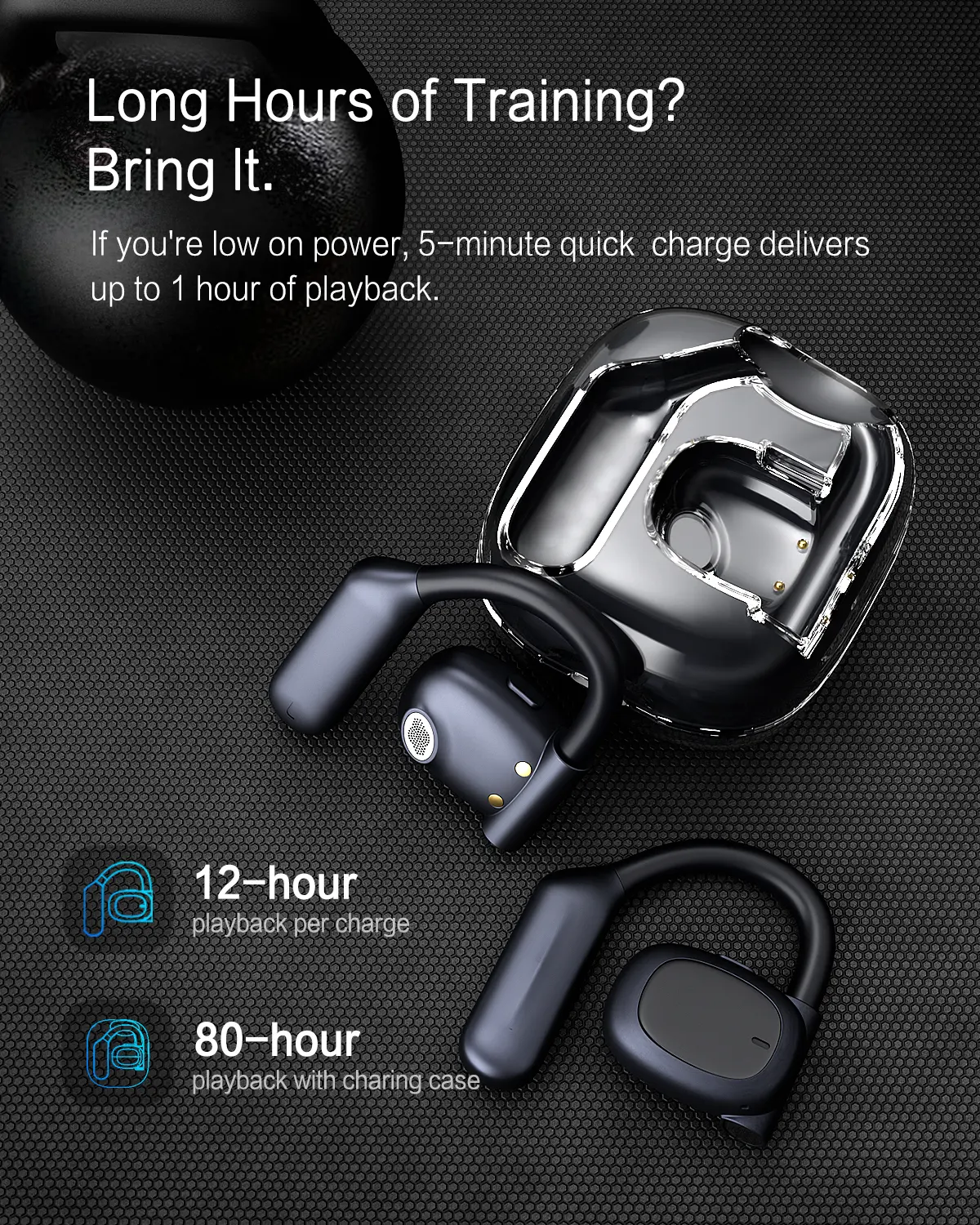 ·【A Week without Charging】Both the ear hook earbuds and the charging case are equipped with large batteries. The power of a single open air earbud can be used for 12-14 hours. The charging box ensure 80-hour continuous use. Quick 5-min charge for 1-hour playtime