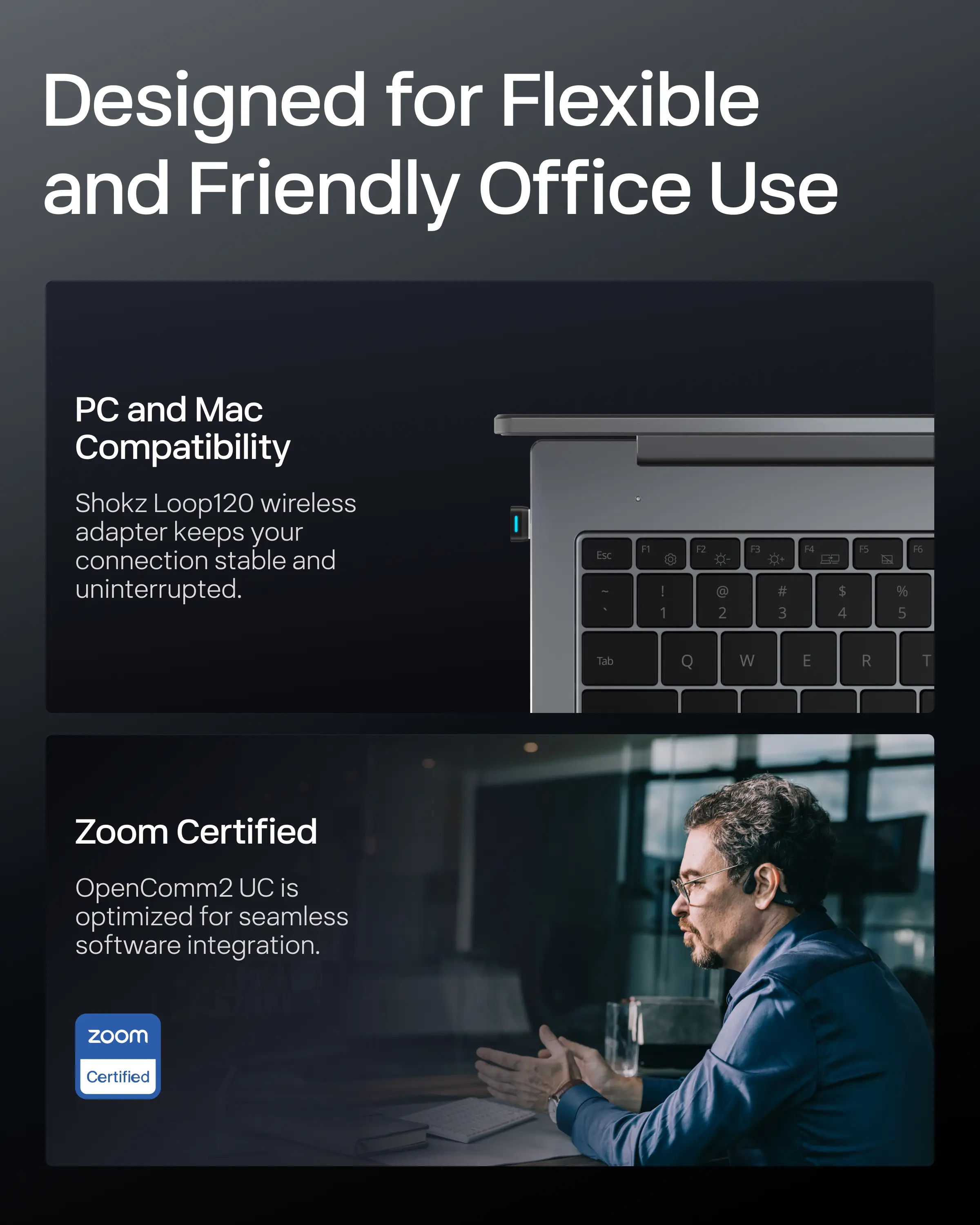 OpenComm2 UC 2025 Upgrade - Open-Ear Wireless Computer Headset with Boom Mic, Bone Conduction Bluetooth Stereo Headphones, USB-A/C Dongle Compatible with PC and Mac, Zoom Certified - C120UC