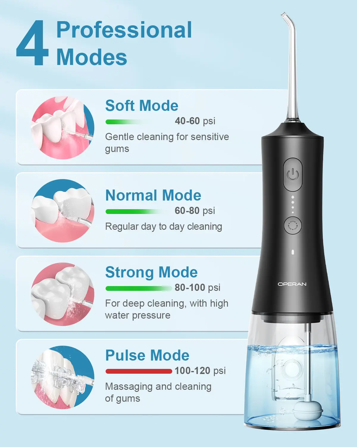 4 modes with professional nozzles: the electric water flosser has four cleaning modes: Gentle, Standard, Pulse, and Powerful. Select Gentle for low-pressure rinsing to prevent bleeding gums, or choose Powerful for thorough gum cleaning with intense water pressure.