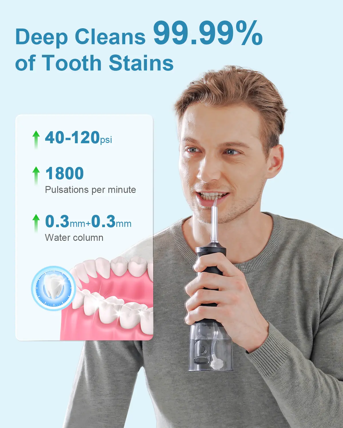 Deep cleaning for gum health maintenance: this cordless dental water flosser delivers water pressure between 40 and 120 PSI, generating 1,800 high-pressure water pulses per minute to remove stains, food debris, and plaque, maintaining oral freshness and whitening teeth.