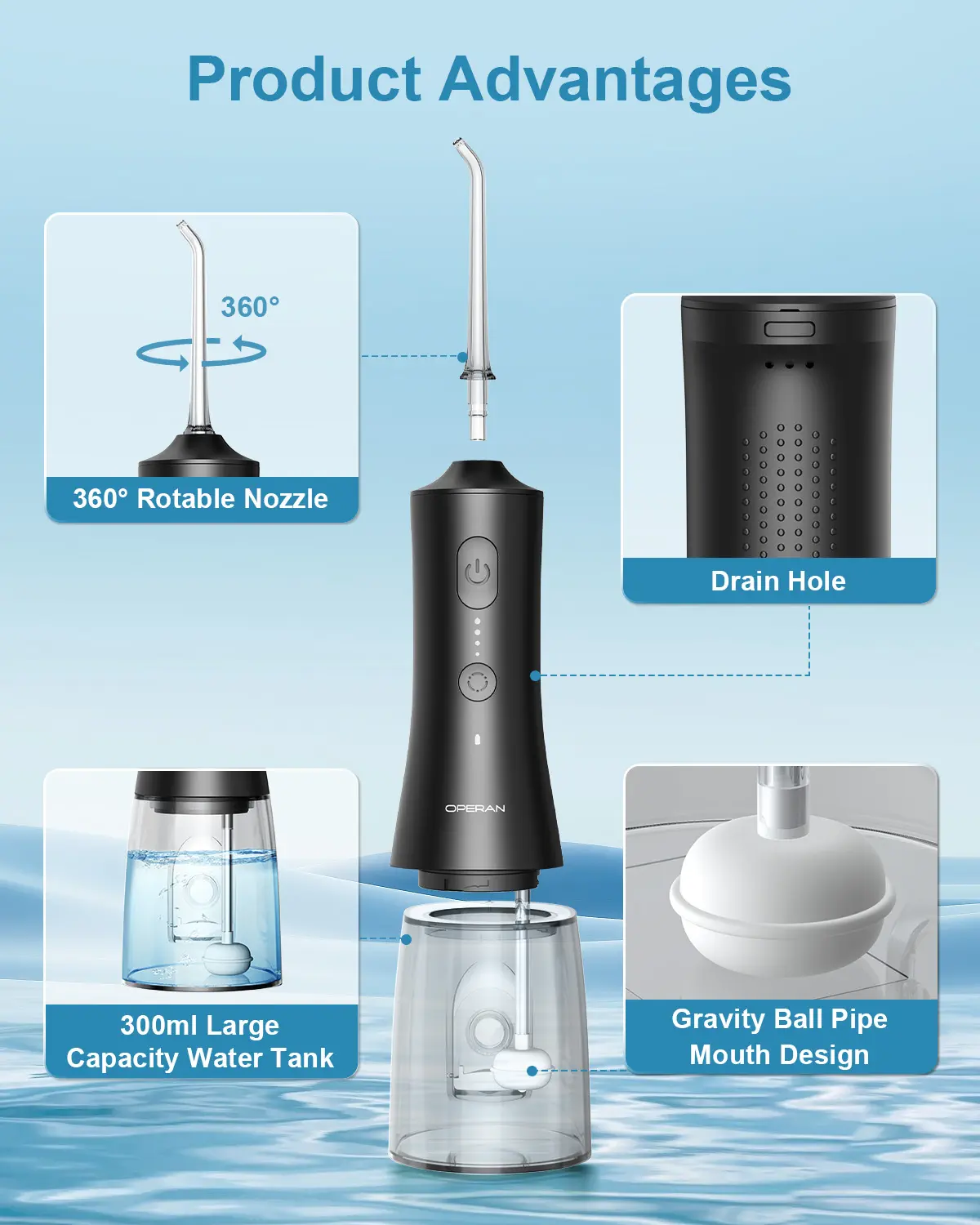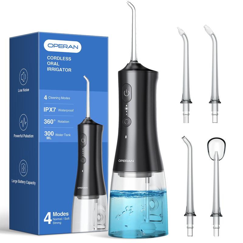Large Capacity Water Tank and IPX7 Waterproof:The 300ml flosser tank is designed to meet the needs of a complete oral cleaning.