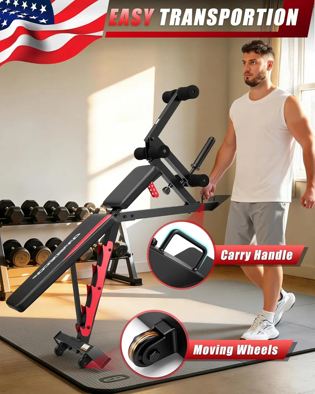 ·【Built-in Wheels & Handle for Effortless Mobility】Effortless mobility is built right in. Simply tilt and roll this sturdy workout bench on its heavy-duty wheels, and use the handle for easy, one-handed transport anywhere in your home gym.