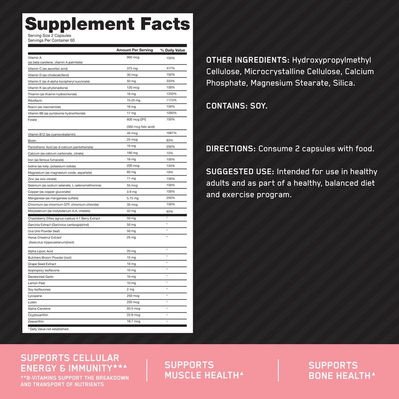 Opti-Women® is more than a multi. It’s a Nutrient Optimization System providing 40 active ingredients including 23 vitamins and minerals designed to support the nutrient needs of active women. Each 2-capsule serving delivers wide-reaching nutrient support in Vegetarian Society approved Vcaps.¹