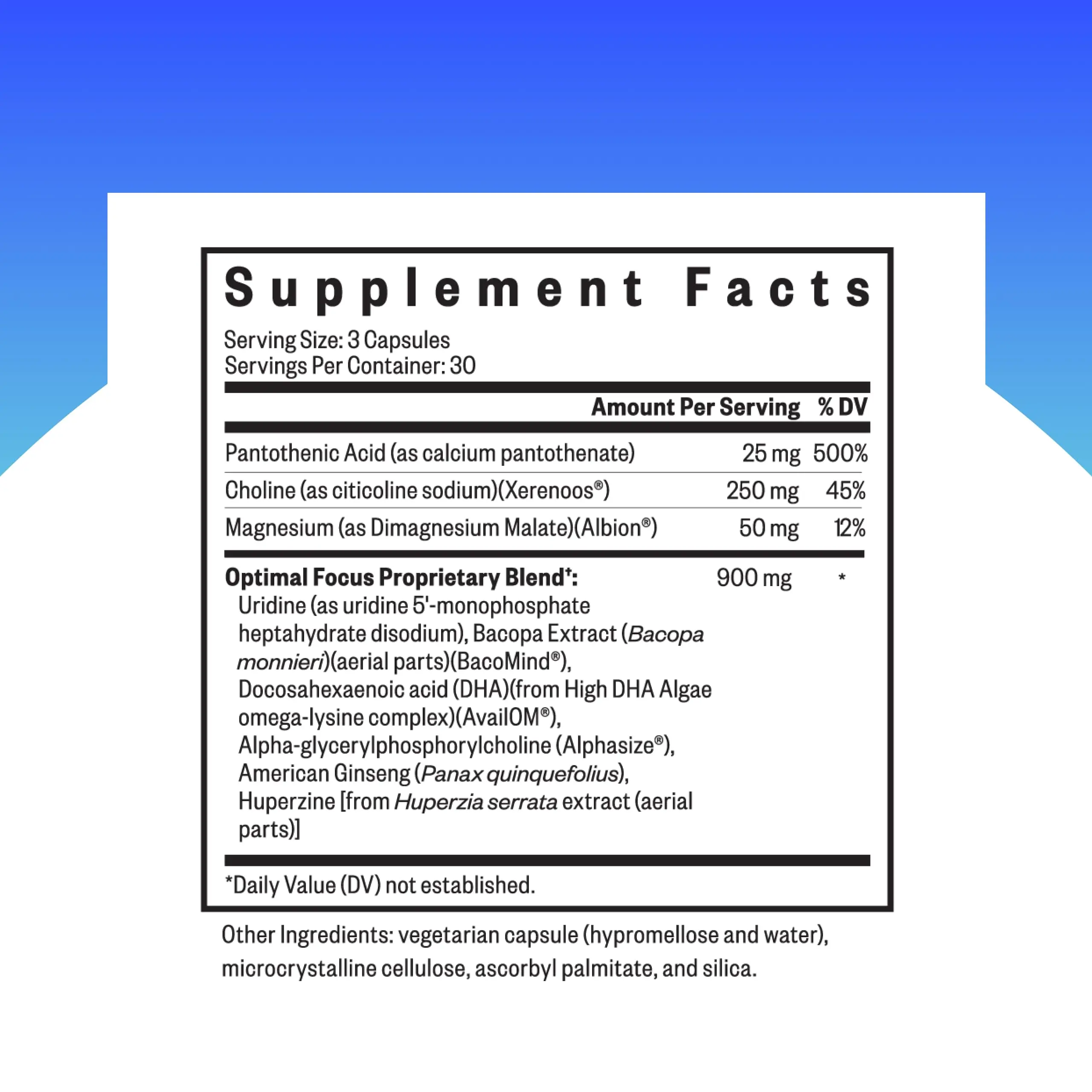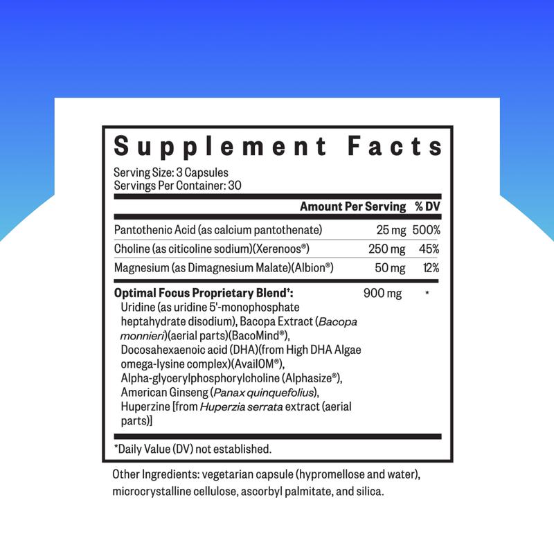 ·Targeted ingredients: Optimal Focus provides 2 forms of bioavailable choline, which plays a major role in brain health and the nervous system. It is also an essential ingredient for making acetylcholine, a neurotransmitter that plays a role in the formation of thoughts, processing information, and organization of memory
