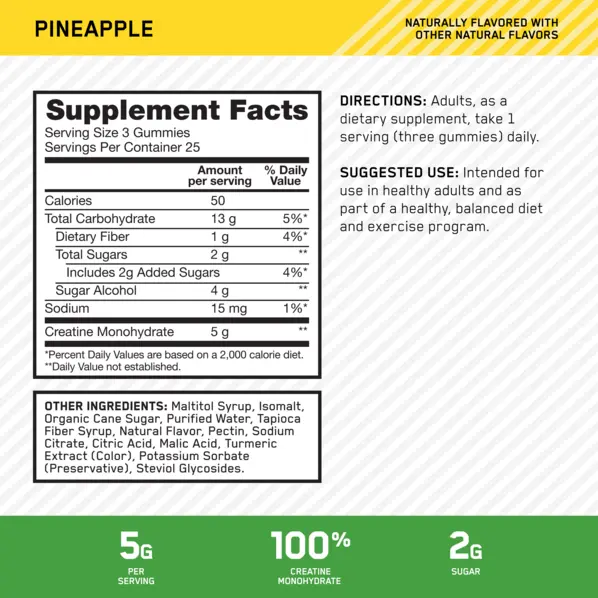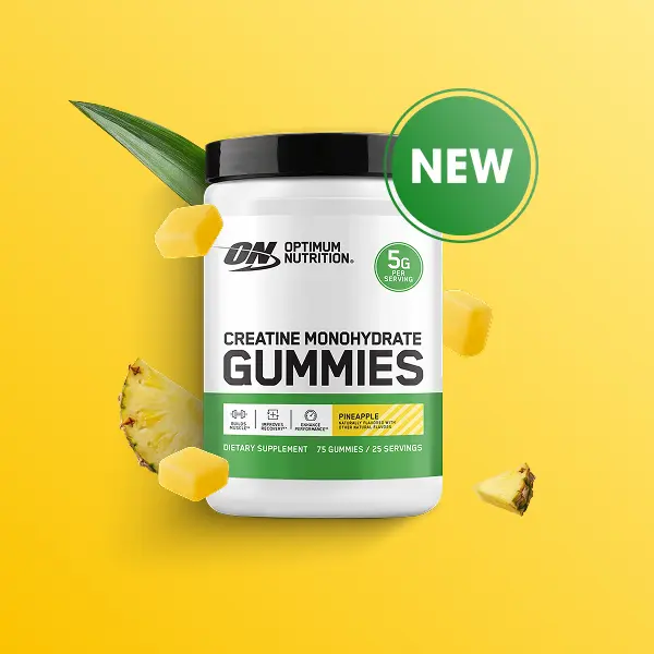 5g of creatine meets a powerful punch of fruit flavor in Optimum Nutrition Creatine Monohydrate Gummies. You’ll finally look forward to your routine for maximizing power and training volume while accelerating recovery¹,³ thanks to its sweet and fruity Pineapple flavor.