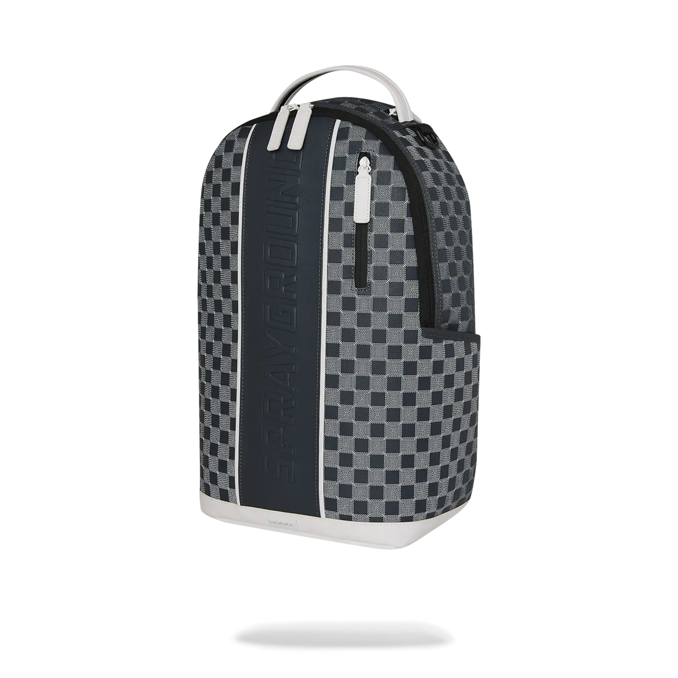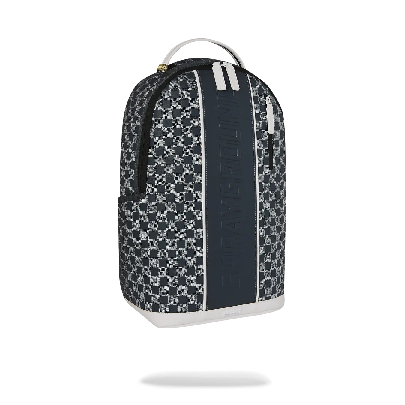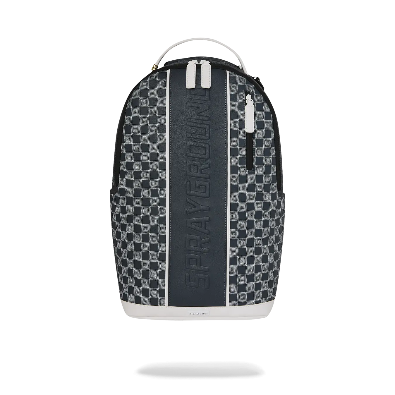 Geometric pattern check with embossed logo on center front stripe with white trim details.