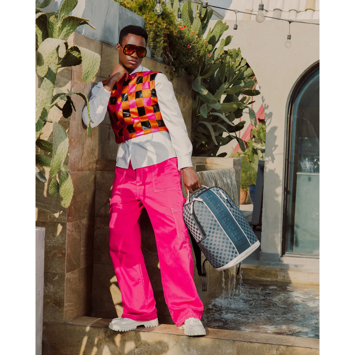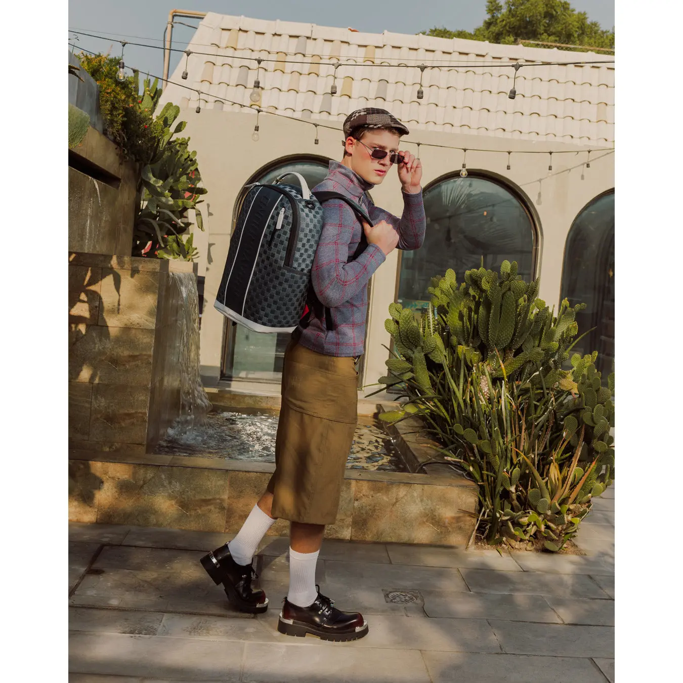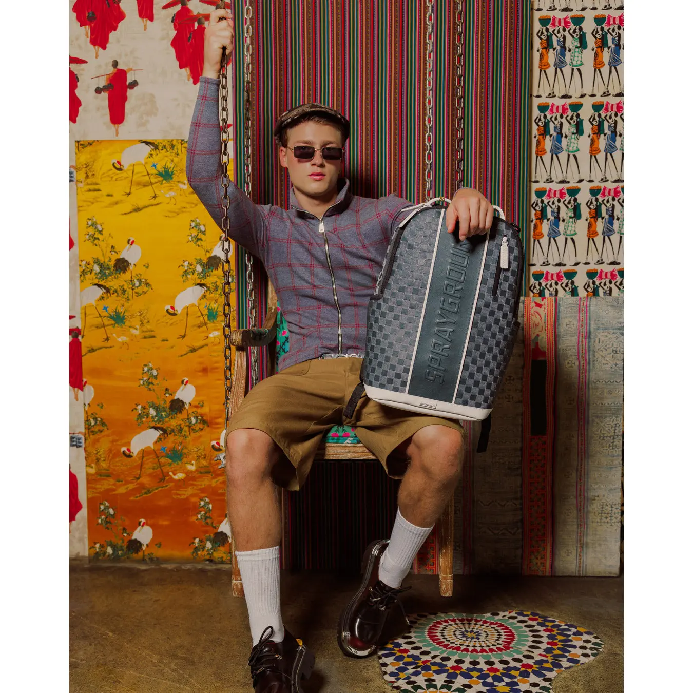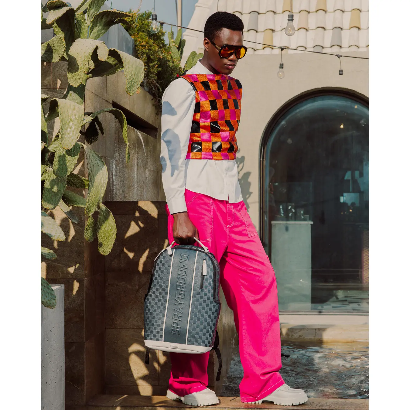 Geometric pattern check with embossed logo on center front stripe with white trim details.