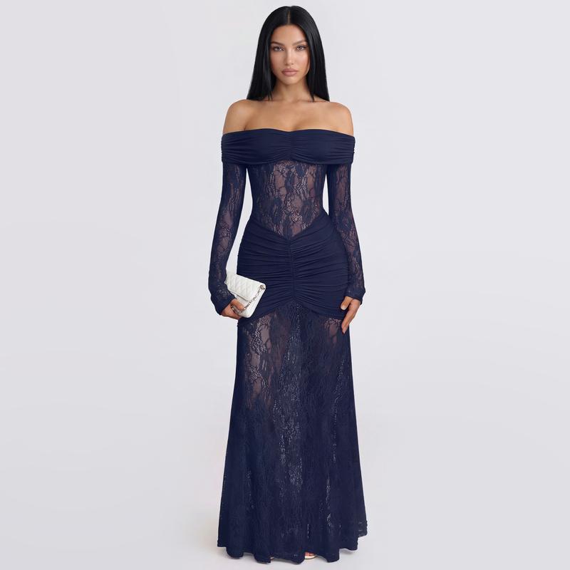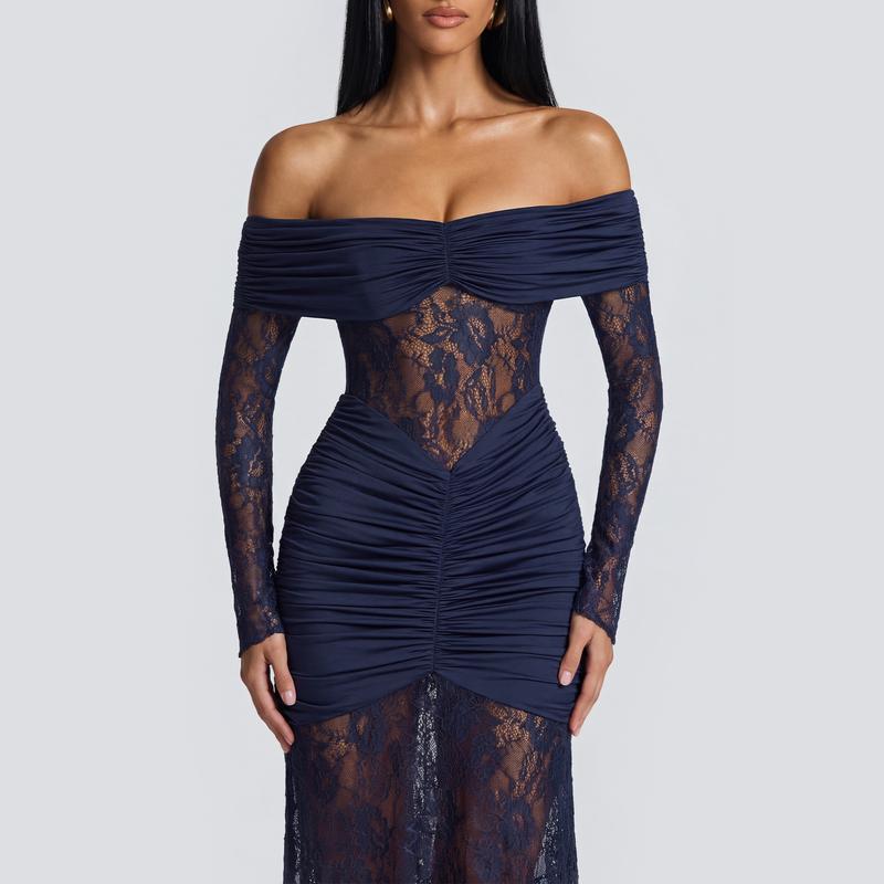 Elevate your evening wardrobe with this off-shoulder lace maxi dress. Featuring a ruched bodice, sheer lace panels, and a curve-accentuating silhouette, it’s perfect for galas, date nights, and special occasions.