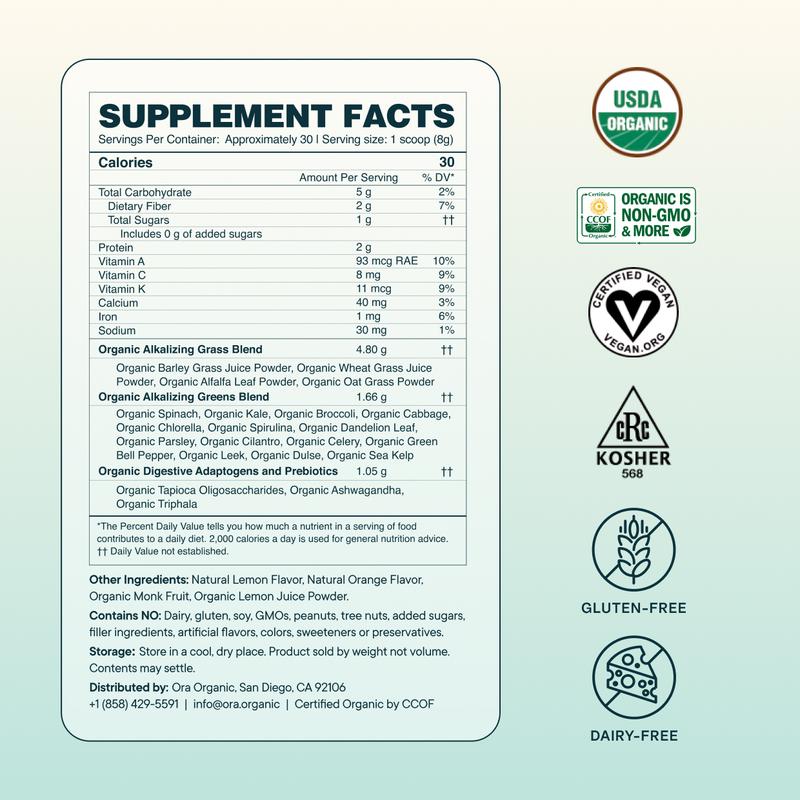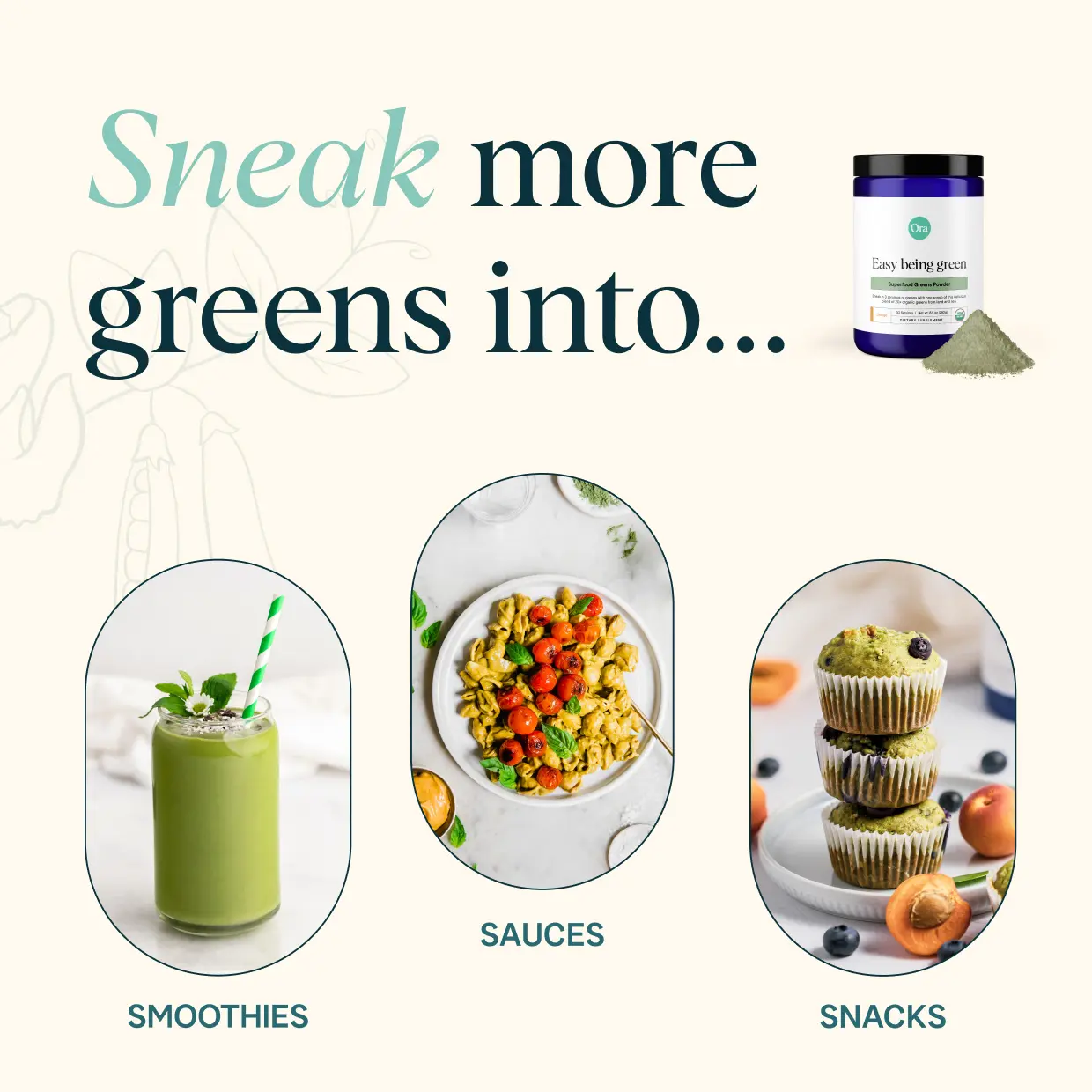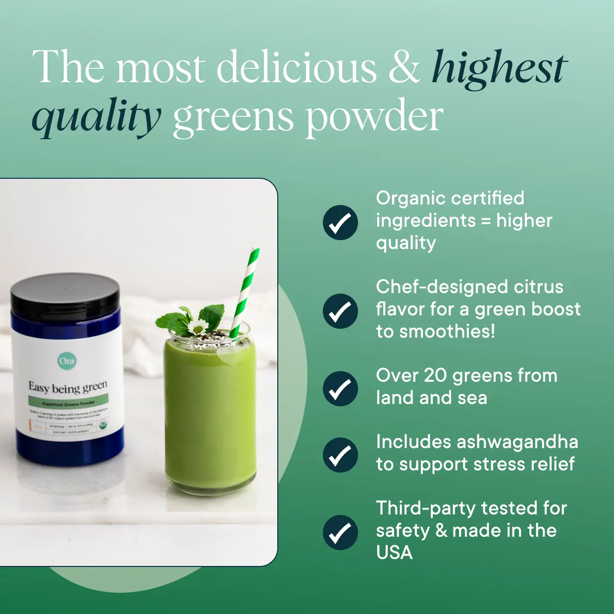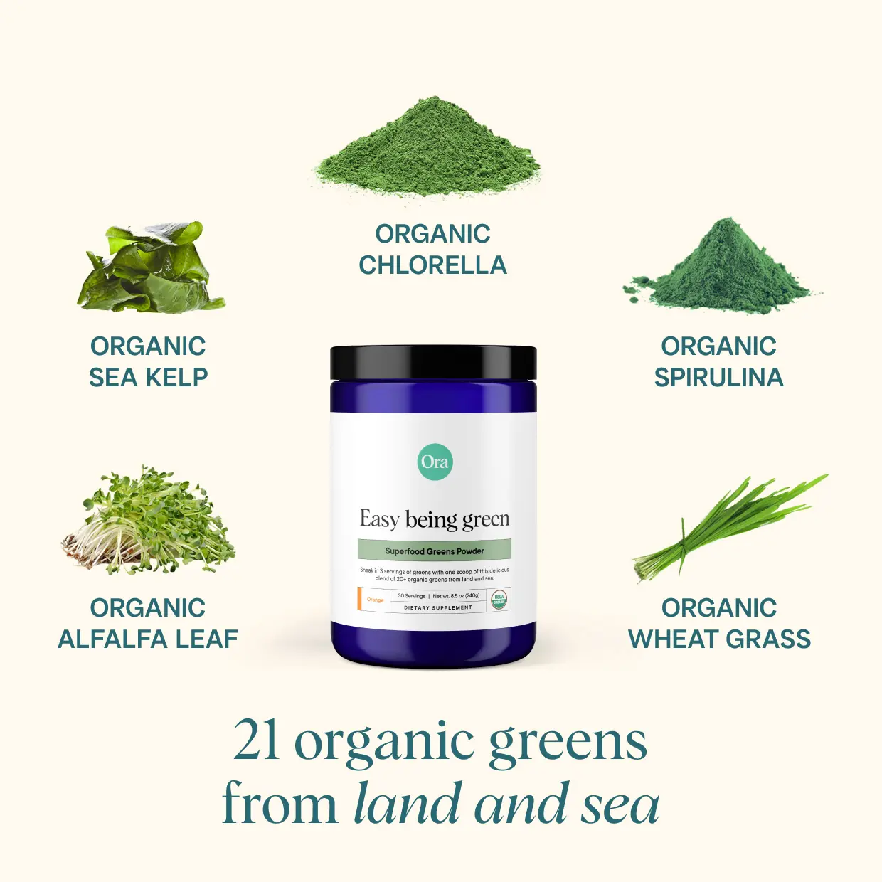 It truly is easy being green! I mix this in my breakfast smoothie and the subtle orange flavor makes it taste so unique and delicious. I feel better than ever, my face is glowing! I now use several Ora products- it’s the new staple for my protein and hormones as well.