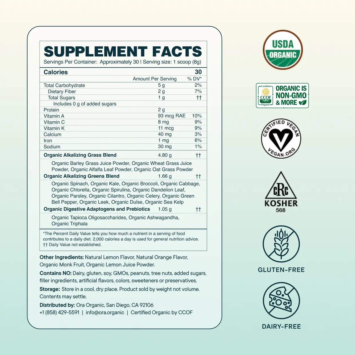 I really like this greens powder. The flavor is a light orange/citrusy taste that I actually enjoy, may not be for everyone, but for me the taste is better than any greens powder I've had before. Really glad I decided to start using Ora products.