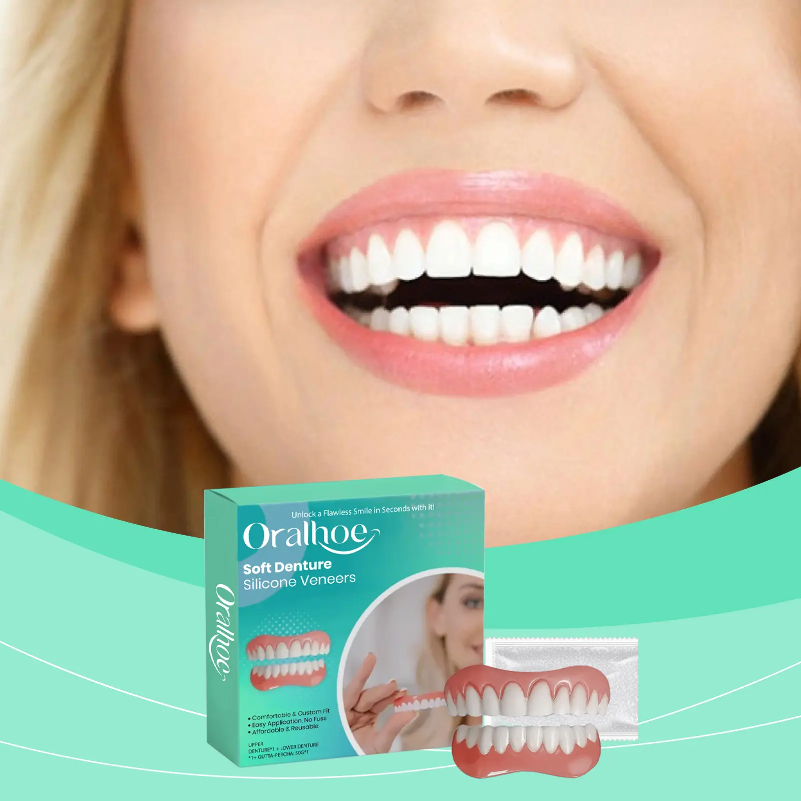 Oralhoe Denture Retainer Veneers are designed to enhance your smile aesthetics. Made from Polyvinyl Alcohol Cross-Linked Polymer and Sodium Polyacrylate, these veneers reduce tooth loss and make your teeth more beautiful. They fill gaps between teeth and improve your smile's brilliance.