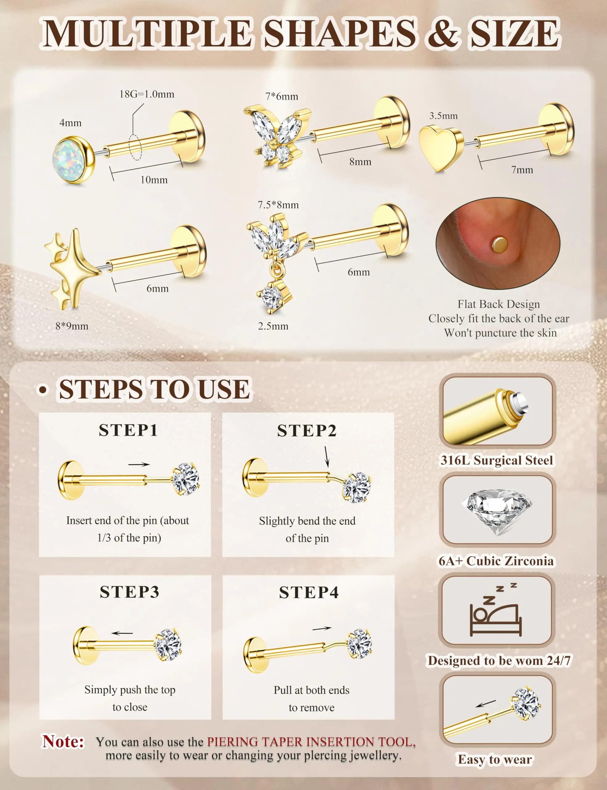 ·Includes: 1 straight piercing taper and 5 flat back gold/silver cartilage earrings