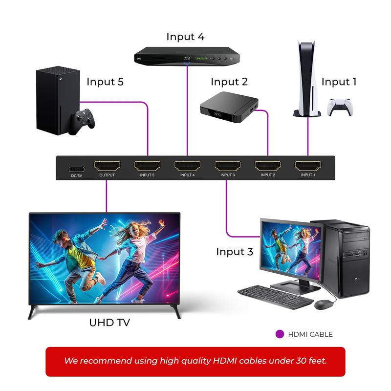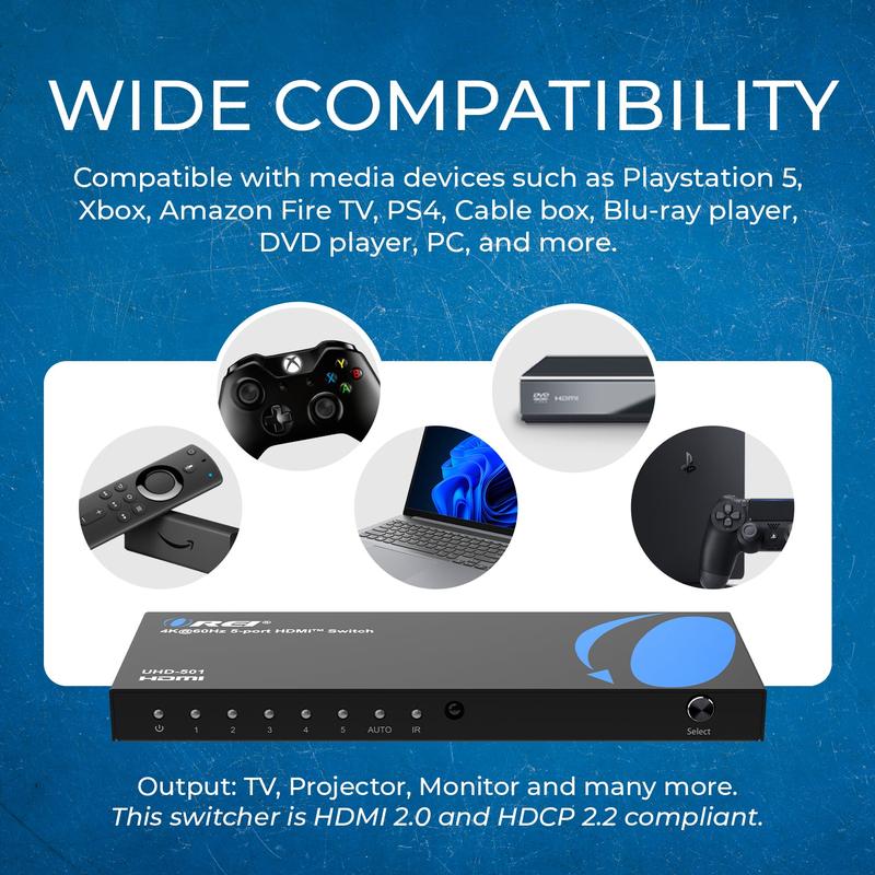 The UHD-501 is a 5x1 HDMI switch designed to streamline your AV setup by allowing five media devices to connect to a single display with superior signal quality.