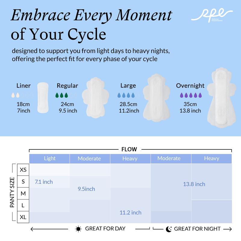 Full Cycle Protection Every Day: 78 pads in 4 sizes-7", 9.4", 11.2", 13.8"— for light to heavy flow and overnight needs.