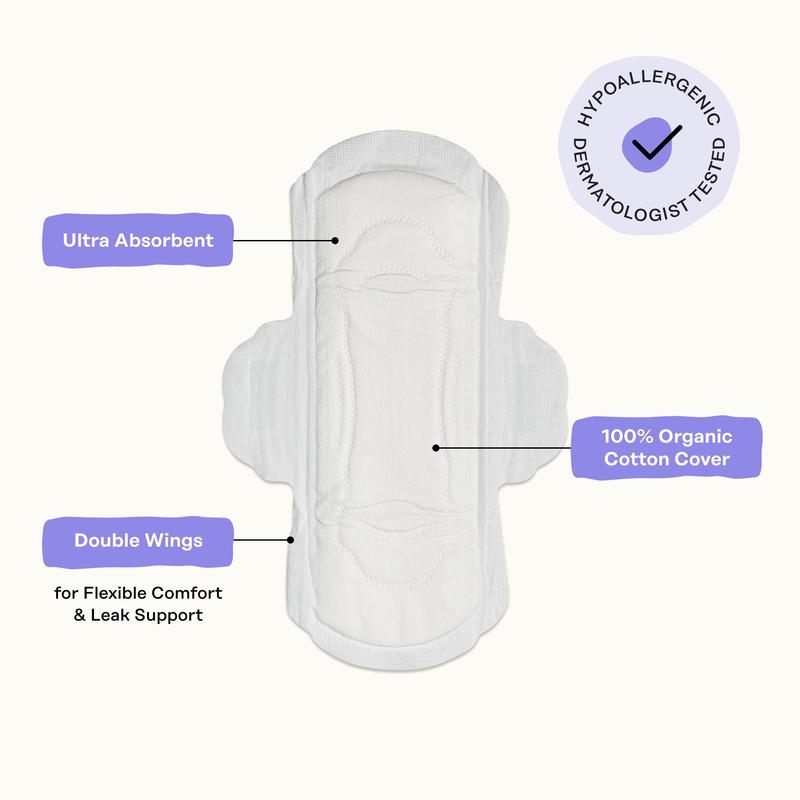 I really like The Honey Pot cotton pads with wings. They’re super soft, comfortable, and stay in place thanks to the wings, which makes a big difference throughout the day.