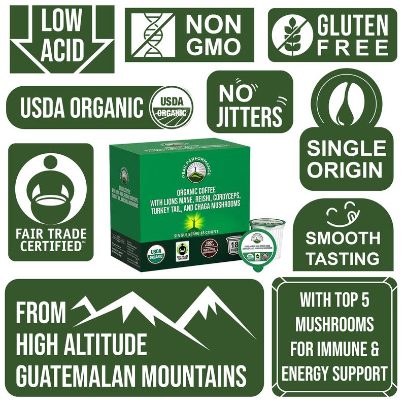·Compatible With All Devices - 100% Recyclable Coffee Pods - Fair Trade - Low Acid - USDA Certified Organic - Single Origin - High Altitude Guatemalan Coffee Pods carefully infused with Lion's Mane, Reishi, Cordyceps, Turkey Tail, Chaga Mushrooms for immune support, energy, performance, and brain boost without the jitters.