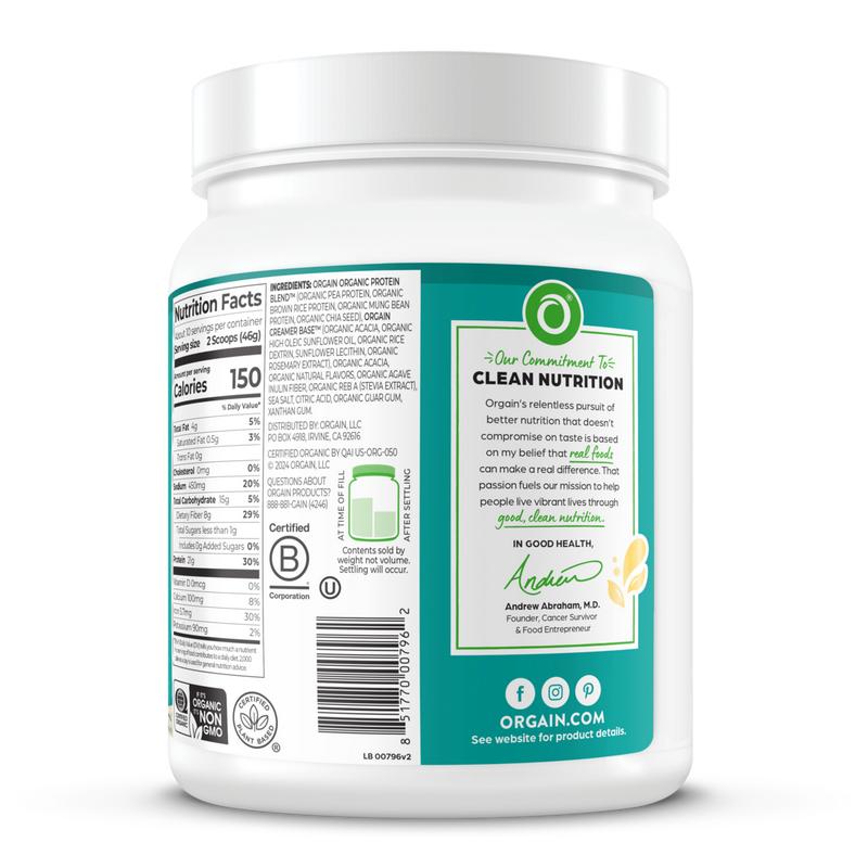 ORGAIN ORGANIC PROTEIN BLENDT™ (ORGANIC PEA PROTEIN,ORGANIC BROWN RICE PROTEIN,ORGANIC MUNG BEAN PROTEIN,ORGANIC CHIA SEED),ORGAIN CREAMER BASET™ (ORGANIC ACACIA,ORGANIC HIGH OLEIC SUNFLOWER OIL,ORGANIC RICE DEXTRIN,SUNFLOWER LECITHIN,ORGANIC ROSEMARY EXTRACT),ORGANIC ACACIA,ORGANIC NATURAL FLAVORS,ORGANIC AGAVE INULIN FIBER,ORGANIC REB A (STEVIA EXTRACT),SEA SALT,CITRIC ACID,ORGANIC GUAR GUM,XANTHAN GUM.