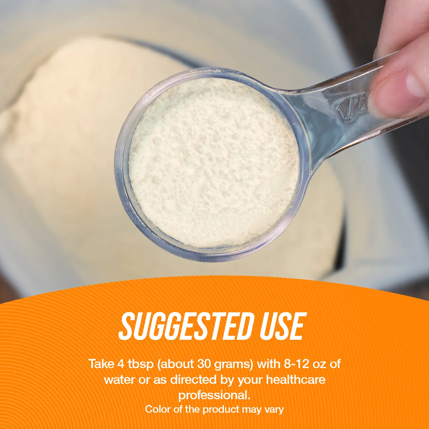 Suggested Use: Take 4 tbsp (about 30 grams) with 8-12 oz of water or as directed by your healthcare professional.