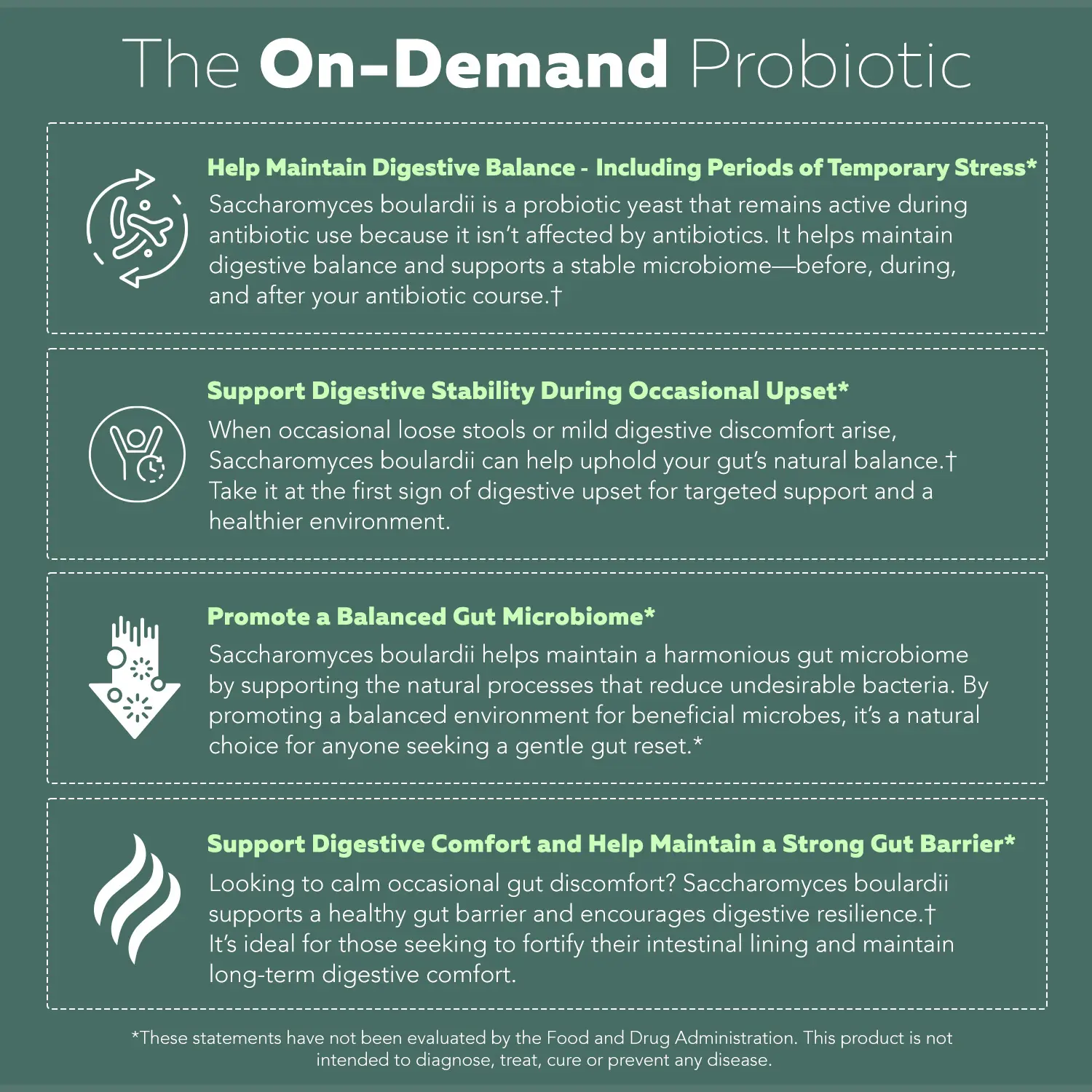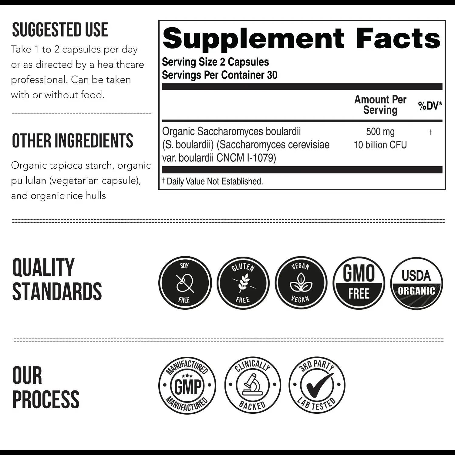 ·Certified Organic & Quality Tested: Made with USDA-certified organic Saccharomyces boulardii, this vegan, GMO-free, and additive-free product is produced in a cGMP-certified facility and third-party tested for safety and purity.